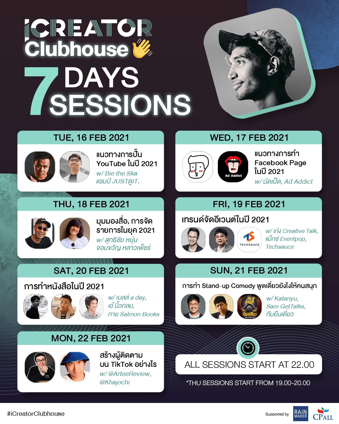 RAiNMaker เปิดตัว iCreator Clubhouse กับ “7 Days 7 Sessions” งานสัมมนาในรูปแบบ Virtual Conference บนแพลตฟอร์ม Clubhouse ที่มาในธีม Content & Digital Media 2021 พร้อมกับเชิญเหล่าคนดังในแวดวงครีเอเตอร์มาร่วมพูดคุยถึงแนวทางคอนเทนต์ในปีนี้ ติดต่อกันทุกวัน ตั้งแต่เวลา 22:00-23:00 น. เป็นเวลา 7 วัน