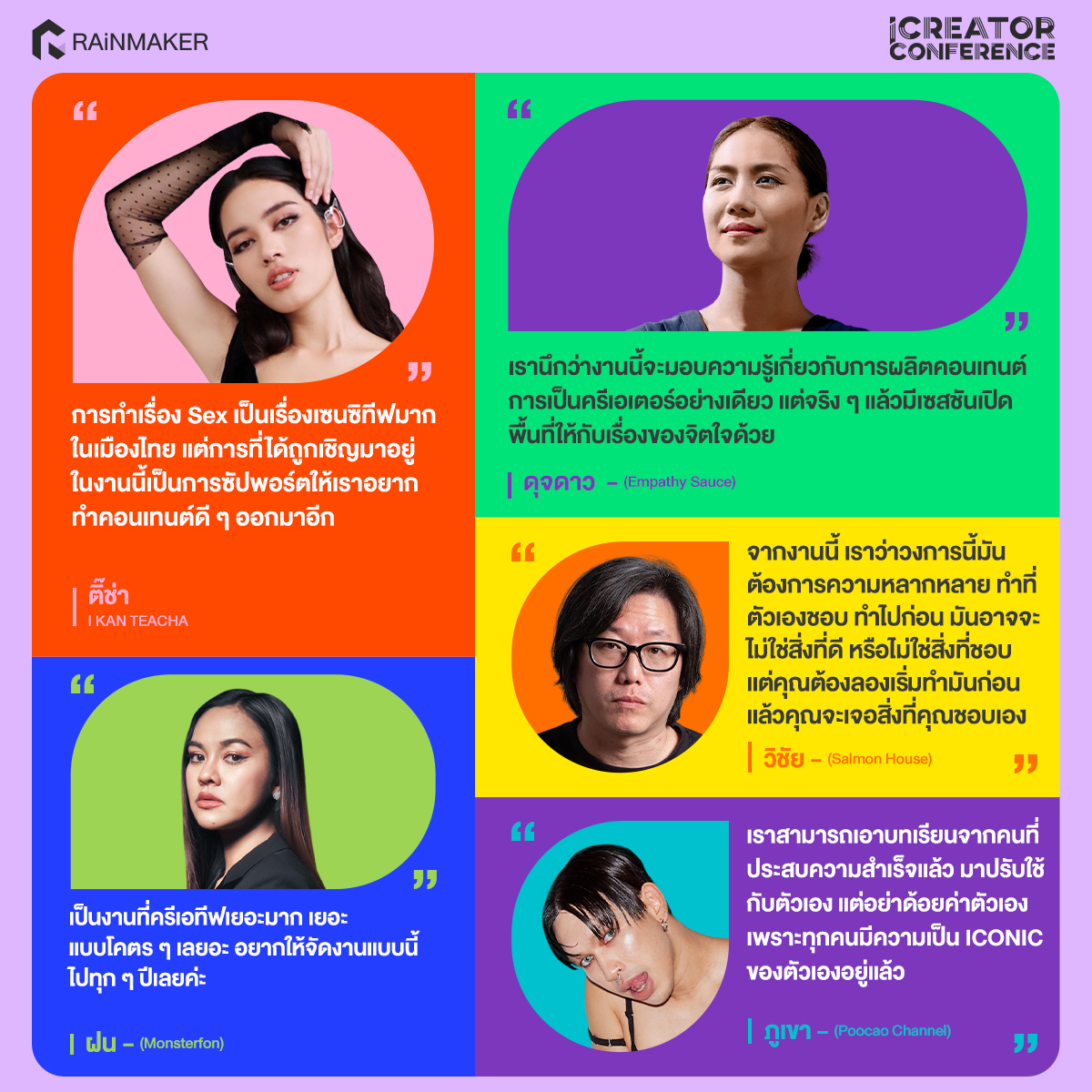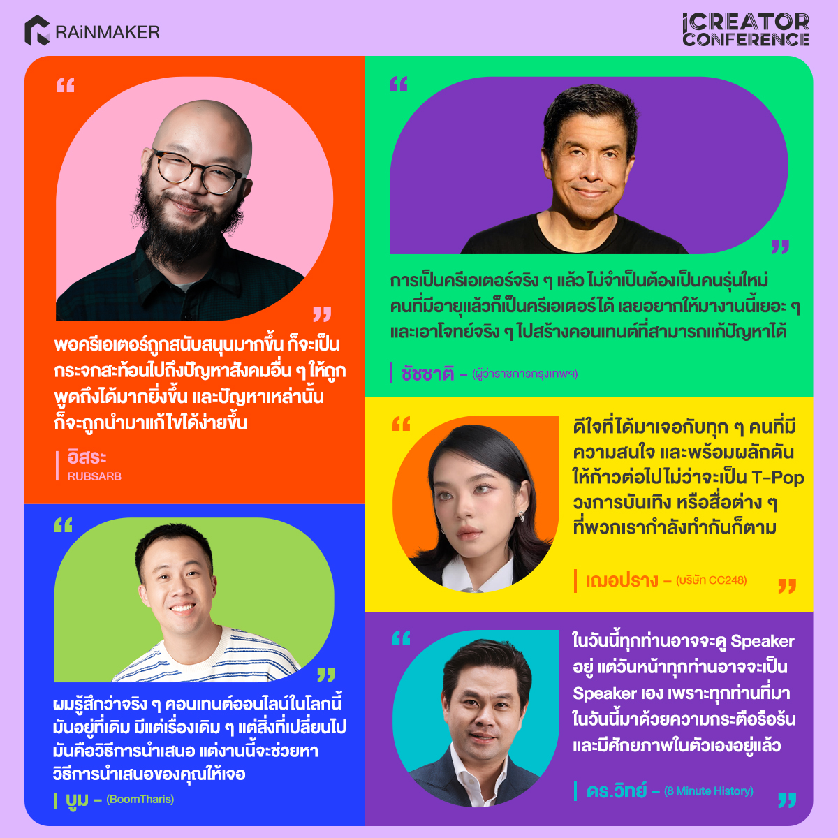 ‘iCreator Conference’ ไม่ได้ถูกสร้างขึ้นมาเพื่อเป็นงานสัมมนารวมตัวคนในวงการคอนเทนต์เท่านั้น แต่ยังเป็นงานที่อยากเชื่อมต่อทุกคนให้ได้รู้ว่า ยังมีครีเอเตอร์อีกหลายคนที่กำลังเดินบนเส้นทางเดียวกันไม่ว่าจะเจอปัญหา หรืออุปสรรคที่ต้องปรับตัวแค่ไหน รวมถึงเป็นกระบอกเสียงให้คนในวงการด้วย อย่างที่ RAiNMaker รวบรวมโควทสัมภาษณ์จากเหล่า Speaker ในงานแต่ละปีมาให้ที่นี่!