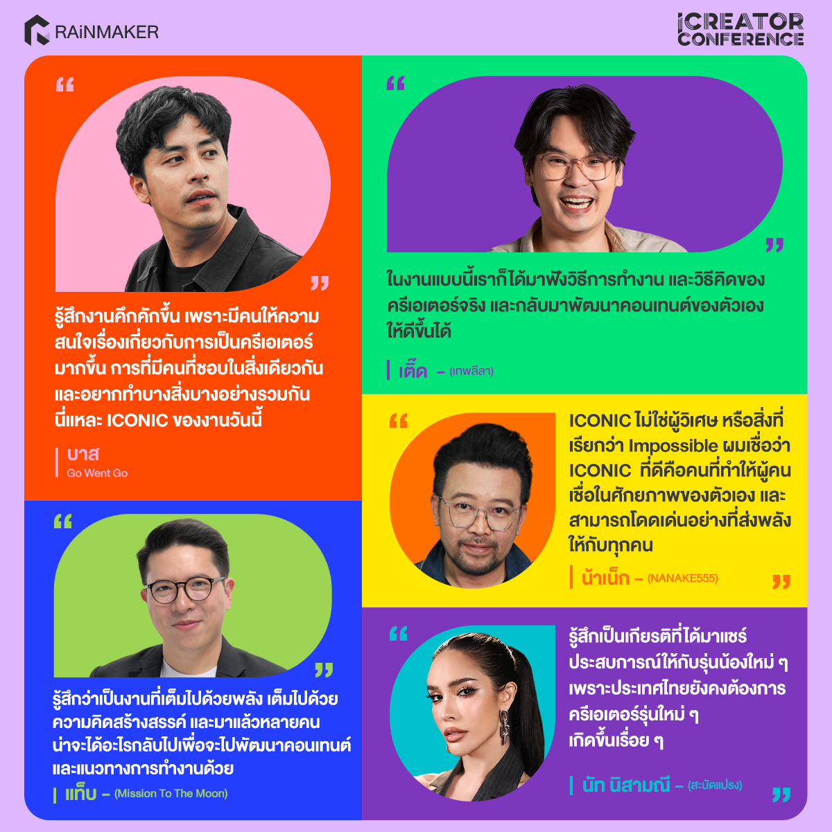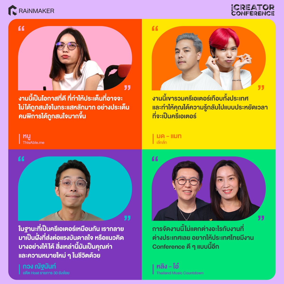 โดยสรุปแล้วจากแง่มุมของเหล่าครีเอเตอร์ที่เราได้หยิบยกมา iCreator Conference ก็ยังคงเป็นพื้นที่โอบรับครีเอเตอร์ทุกสายและคอนเทนต์ทุกประเภทอยู่เสมอ ใครที่ยังไม่เคยมางานนี้หรือเคยมาแล้วแต่อยากมาอีกในปีนี้ ก็สามารถตั้งตารอความสดใหม่จากงาน iCreator Conference 2025 ได้เลย!
