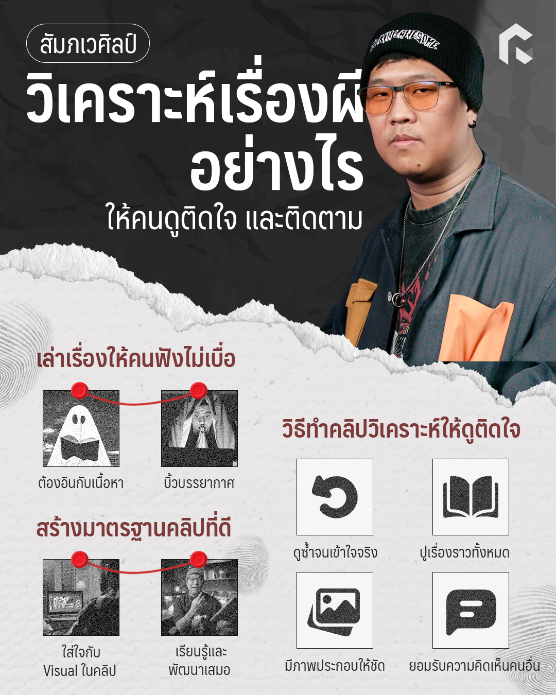 คอนเทนต์ของสัมภเวศิลป์ไม่เคยหยุดนิ่ง ย้อนไปที่จุดเริ่มต้นที่การเล่าเรื่องผี จนมาถึงการวิเคราะห์หนังเรื่องบอดี้ศพ 19 ซึ่งกลายเป็นจุดประกายสำคัญของคลิปแนววิเคราะห์ กระบวนการเหล่านี้ไม่ได้เกิดจากความบังเอิญ แต่มาจากการเก็บรวบรวมข้อมูลหลังบ้าน และหมั่นรับฟังความต้องการของผู้ติดตามอย่างต่อเนื่อง เพื่อนำมาสู่การพัฒนาคอนเทนต์ในทุกมิติ ทั้งด้านเนื้อหาและเทคนิคจนประสบความสำเร็จเป็นช่องสัมภเวศิลป์ที่ทุกคนเห็นดังทุกวันนี้