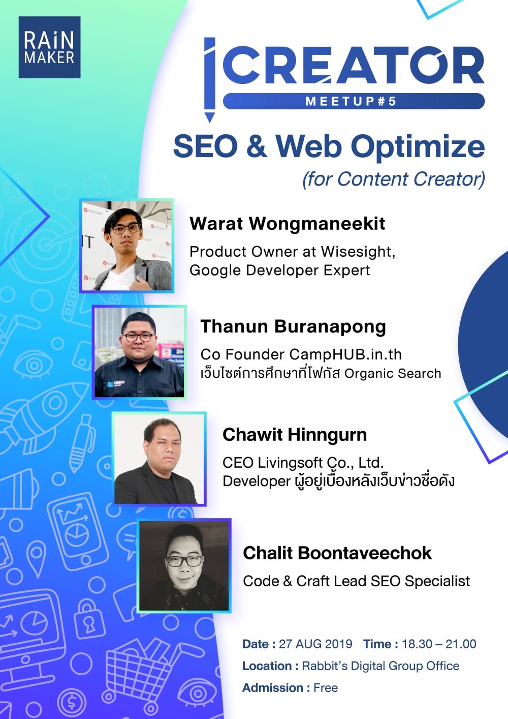 iCreator Meetup ครั้งที่ 5 เราจะมาพูดคุยกันในหัวข้อ SEO & Web Optimize คนทำคอนเทนต์ต้องทำอย่างไรให้บทความบนเว็บไซต์ถูกพบบน Search Engine อย่างสวยงาม เพราะ SEO ไม่ใช่แค่หน้าที่ของ Developer รวมไปถึงอัลกอริธึมของ Google เองก็มีการปรับเปลี่ยนอยู่ตลอดเวลาเช่นกัน