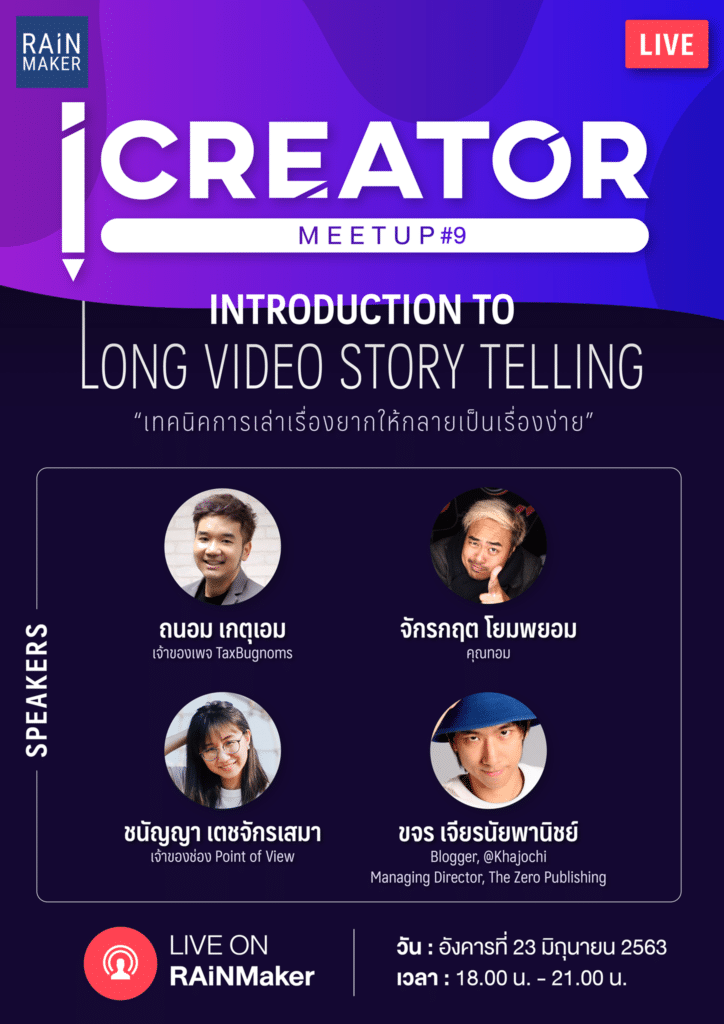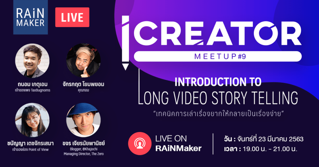 เรากลับมาเเล้วค่ะ ทุกคนคิดถึงเรากันมั้ยคะ? ^^ และครั้งนี้งาน MeetUp คร้งที่ 9 ของเรายังคงจัดแบบ “LIVE สดผ่านเพจ RAiNMaker” นั่นแปลว่าทุกคนสามารถเข้าชมได้ทุกคนรับฟังความรู้ไปพร้อมๆ กันแบบไม่จำกัดสิทธิ์เลยค่ะ เย่ๆ โดยหัวข้อครั้งนี้เป็นเรื่องเกี่ยวกับ “เทคนิคการเล่าเรื่องยากให้กลายเป็นเรื่องง่าย” เราจะถ่ายทอดเรื่องราวที่ยากหรือซับซ้อนให้ออกมาอย่างไร ให้คนทั่วไปสามารถเข้าใจเเละนำไปใช้ประโยชน์ต่อได้ง่ายๆ