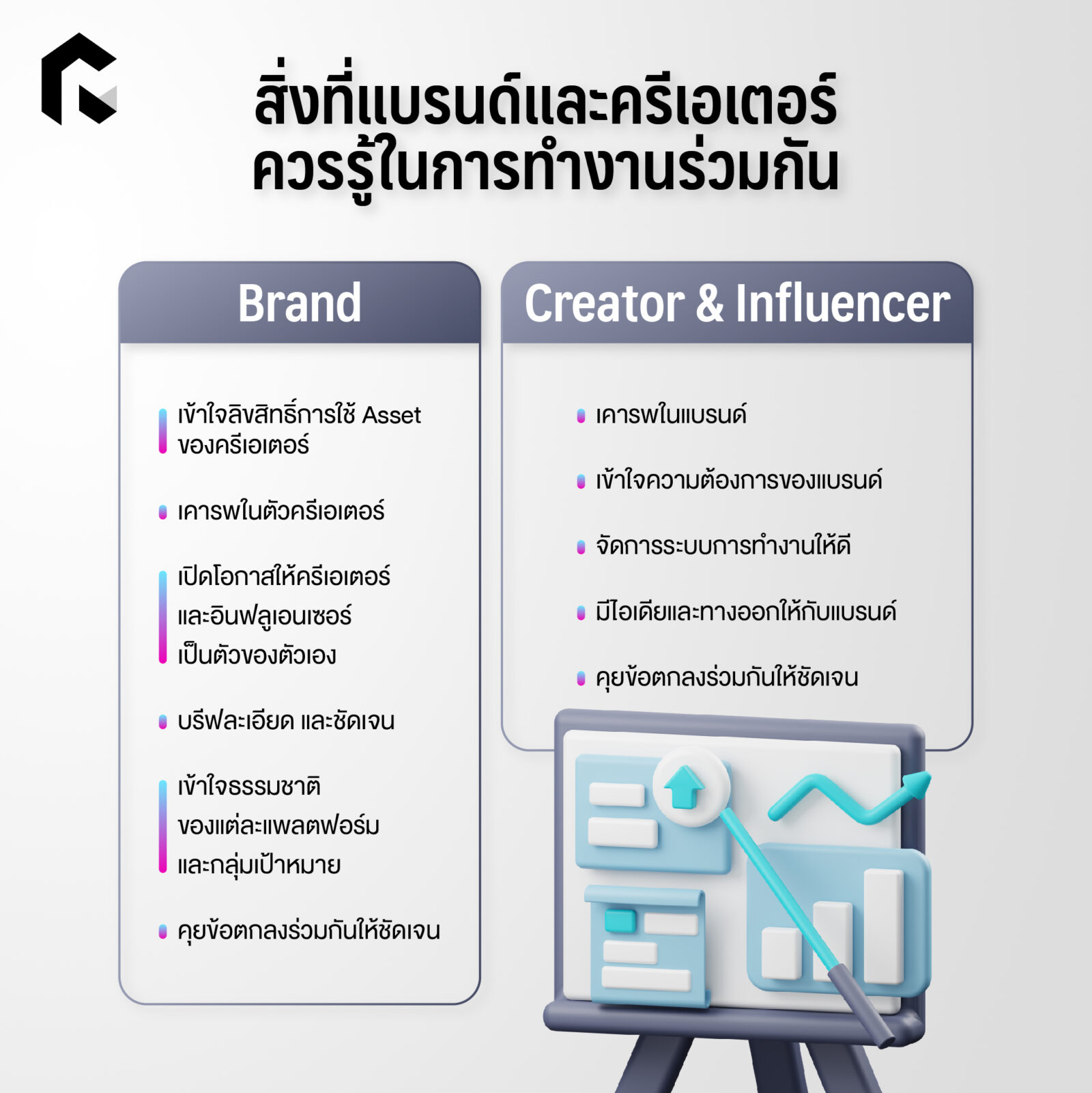 การทำงานด้วยกันจะต้องอยู่พื้นฐานของความเคารพซึ่งกันและกัน รวมถึงการพูดคุยให้เข้าใจตรงกันชัดเจนตั้งแต่แรกจะช่วยให้ผลลัพธ์ออกมาดี และเกิดผลดีกับทุกฝ่าย ฝั่งแบรนด์เองก็ควรจะทำความเข้าใจครีเอเตอร์และอินฟลูเอนเซอร์ตั้งแต่เลือกมา ไม่บังคับหรือยัดเยียดความเป็นแบรนด์ตัวเองลงไปในตัวครีเอเตอร์และอินฟลูเอนเซอร์มากเกินไปจนกลืนกินความเป็นตัวเองของพวกเขา