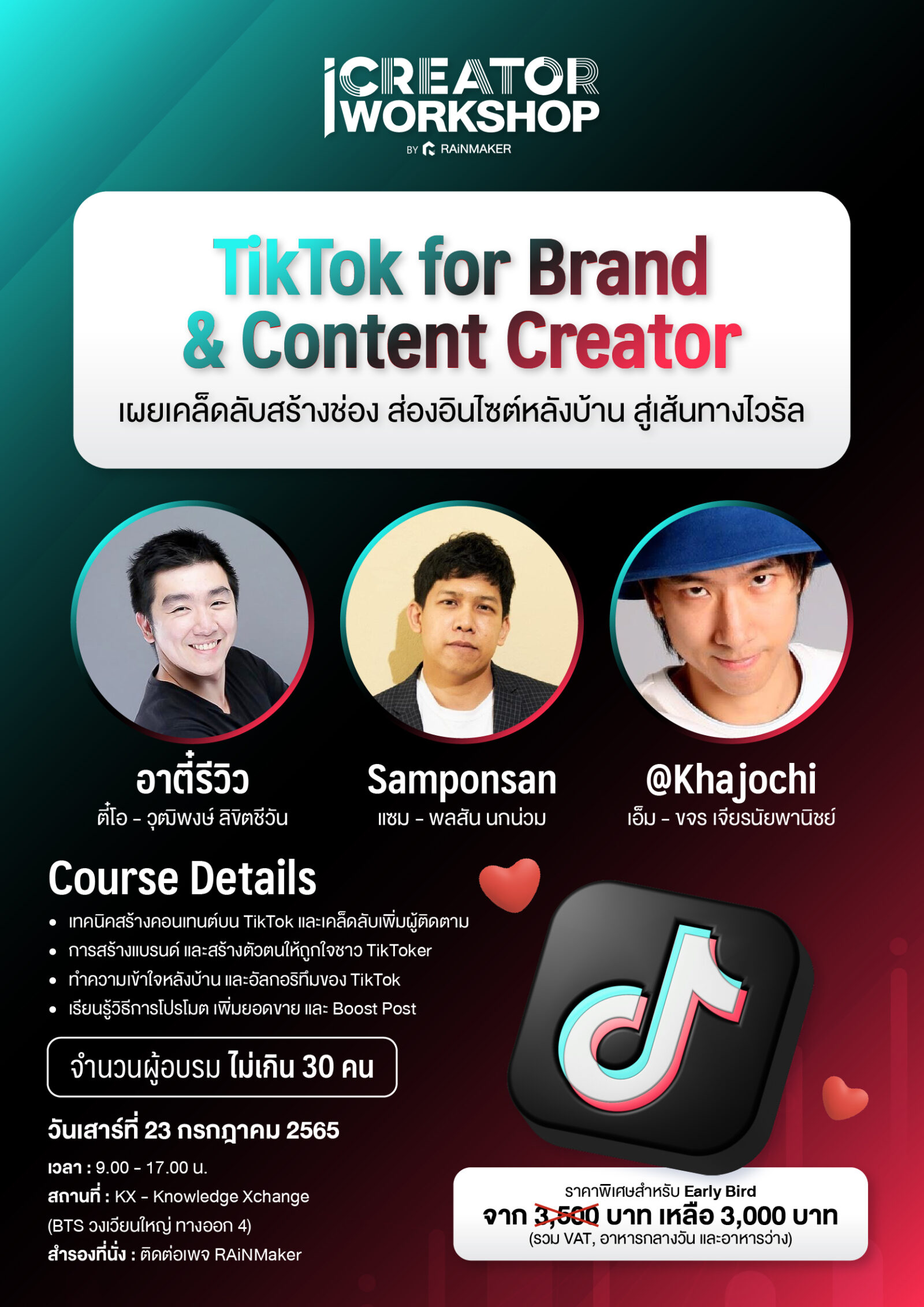- ราคาพิเศษรอบ Early Bird 3,000 บาท จากราคาปกติ 3,500 บาท (รวมค่าอาหารกลางวัน และอาหารว่างแล้ว)