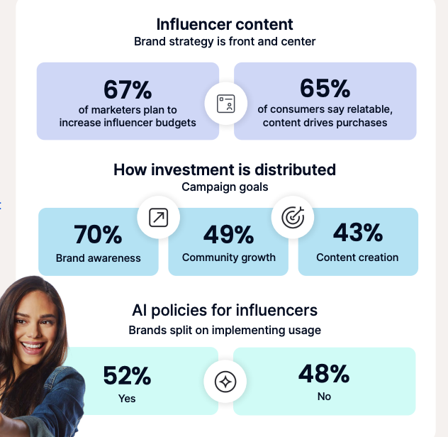 อินฟลูเอนเซอร์ไม่ได้เป็นเพียงตัวเลือกการทำการตลาดเท่านั้น แต่กลายเป็นหัวใจของการทำการตลาดไปแล้ว เพราะกว่า 67% มองที่จะแพลนบัดเจ็ทเพื่อจ้างอินฟลูเอนเซอร์เพิ่มขึ้นในปี 2026 เพราะผู้คนให้ความเชื่อใจคอนเทนต์ที่มีอินฟลูเอนเซอร์ และตัดสินใจซื้อได้ง่ายขึ้น