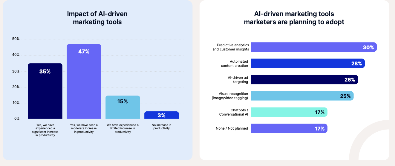 นอกจากนี้อิทธิพลของ AI ของส่งผลแตกต่างกันไปตามเครื่องมือทางการตลาดที่ใช้ โดยมีเพียง 35% เท่านั้นที่ได้รับประสบการณ์และกำไรเพิ่มขึ้น แต่อีก 47% ยังไม่แน่ใจว่าเครื่องมือนั้นจะใช้ให้เกิดประโยชน์ได้มากที่สุดอย่างไรในชีวิตประจำวัน