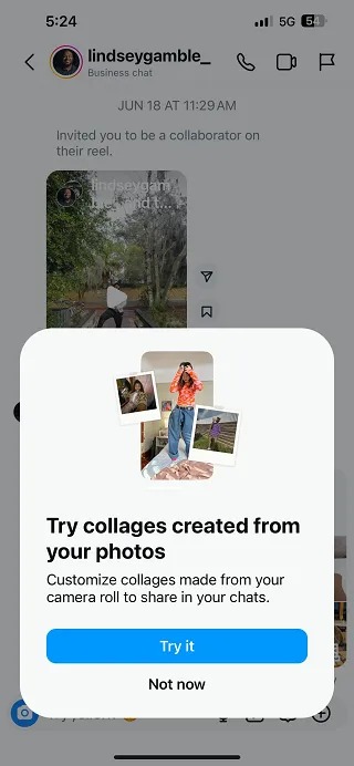 นอกจากนี้ Instagram ยังทดสอบฟีเจอร์ Collage ในแชตกลุ่ม ที่ทำงานเหมือนกับบน Stories เพื่อให้ผู้ใช้สามารถจัดวางหลาย ๆ ภาพในโพสต์เดียวและส่งผ่านแชต ทั้งนี้ก็เพื่อกระตุ้นให้คนโพสต์ Stories ในแบบของตัวเองได้เต็มที่ และผลักดันให้เกิดการเชื่อมต่อกันในแชตมากขึ้นอีกด้วย ซึ่งทั้งหมดนี้ก็ส่งผลต่อการเพิ่มยอดเอนเกจเมนต์โดยรวมภายในแอปนั่นเอง
