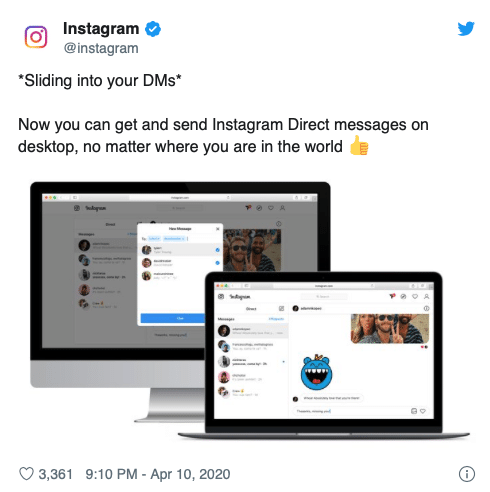 แต่ล่าสุดอินสตาแกรมได้พัฒนาข้อจำกัดนี้ จนสามารถใช้งานได้ครบทุกฟีเจอร์บนคอมพิวเตอร์แล้ว โดยได้ประกาศผ่านทางทวิตเตอร์เมื่อวันที่ 10 เม.ย. ที่ผ่านมา โดยรูปแบบการทำงานของฟีเจอร์นี้จะเหมือนกับการใช้งานผ่านโทรศัพท์มือถือทุกประการ ซึ่งเมื่อเราล็อกอินในเว็บเบราว์เซอร์แล้ว เราจะสามารถเห็นไอคอนของ DM ทางมุมบนขวา ซึ่งเมื่อกดเข้าไปแล้วก็จะพบกับบทสนทนาของเรา อีกทั้งยังสามารถส่งข้อความหาเพื่อน ได้จากหน้าโปรไฟล์โดยตรง นอกจากนี้ หากต้องการเปิดการแจ้งเตือน ก็สามารถทำได้ด้วยค่ะ