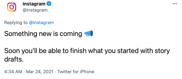 ล่าสุดก็ได้มีประกาศออกมาว่าจะเพิ่มตัวเลือกใหม่ให้สามารถบันทึกสตอรีเป็นดราฟต์ไว้ก่อนโพสต์ได้ ปัจจุบันสตอรีนับเป็นอีกฟีเจอร์ของอินสตาแกรมที่มีผู้ใช้เพิ่มขึ้นเป็นจำนวนมาก จนพูดถึงอินสตาแกรมก็จะนึกถึงสตอรีเป็นอย่างแรกๆ เลยก็ว่าได้ ทางอินสตาแกรมเลยมุ่งหาตัวเลือกเพื่อที่จะให้ผู้ใช้ได้ใช้ประโยชน์จากสตอรีให้ได้มากที่สุด และเพื่อช่วยสร้างผลประโยชน์ให้กับแบรนด์ในการใช้สตอรีในการโปรโมตไปถึงกลุ่มเป้าหมาย