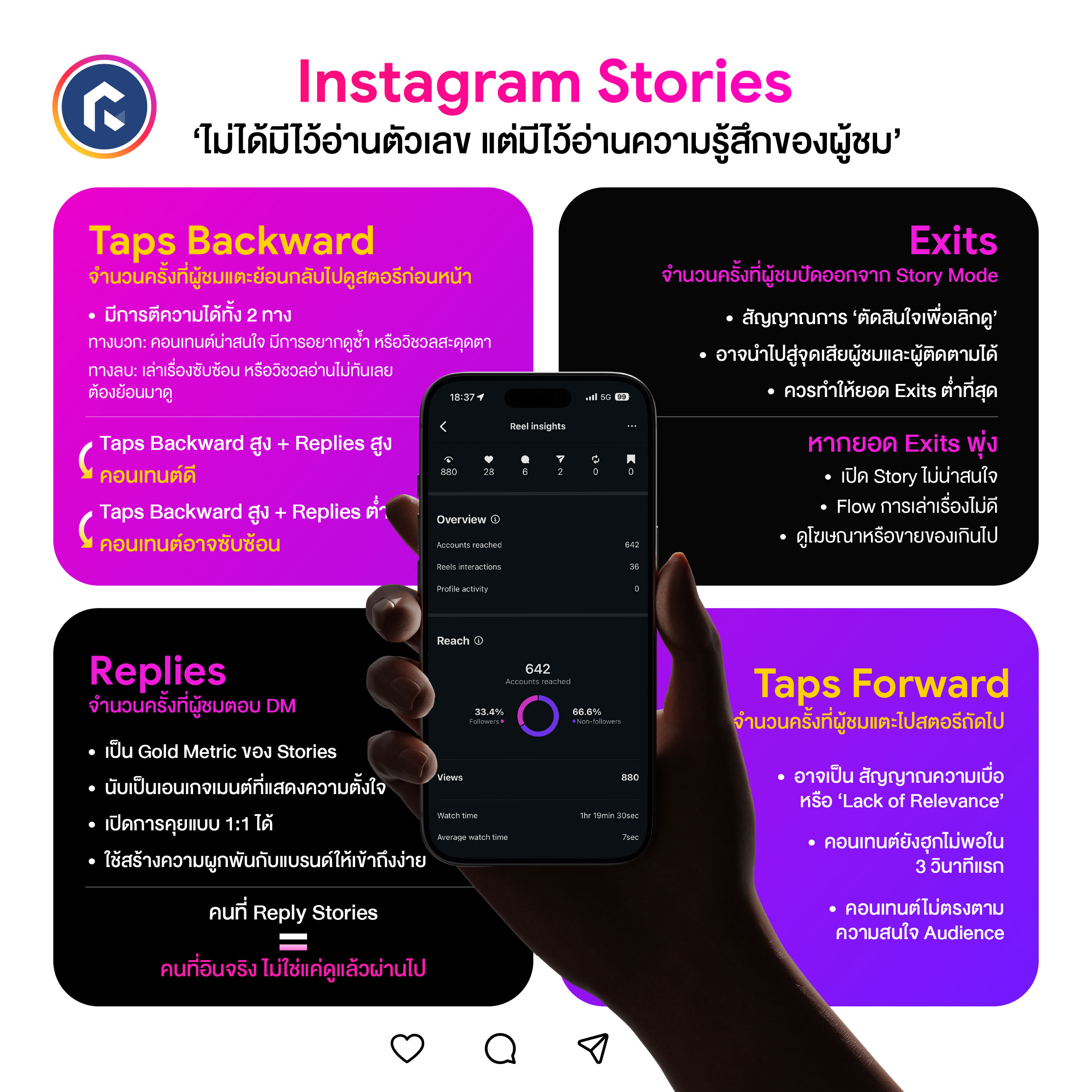 และหากมีการดูแค่ยอด Views ก็จะเห็นแค่ ‘คนดู’ แต่ถ้าดู Taps, Reply และ Exits ด้วย ก็จะมองภาพได้กว้างและลึกขึ้นว่าคุณภาพคอนเทนต์ของเราเป็นอย่างไรในวันที่ผู้คนเสพคอนเทนต์เหมือนกันทุกวัน