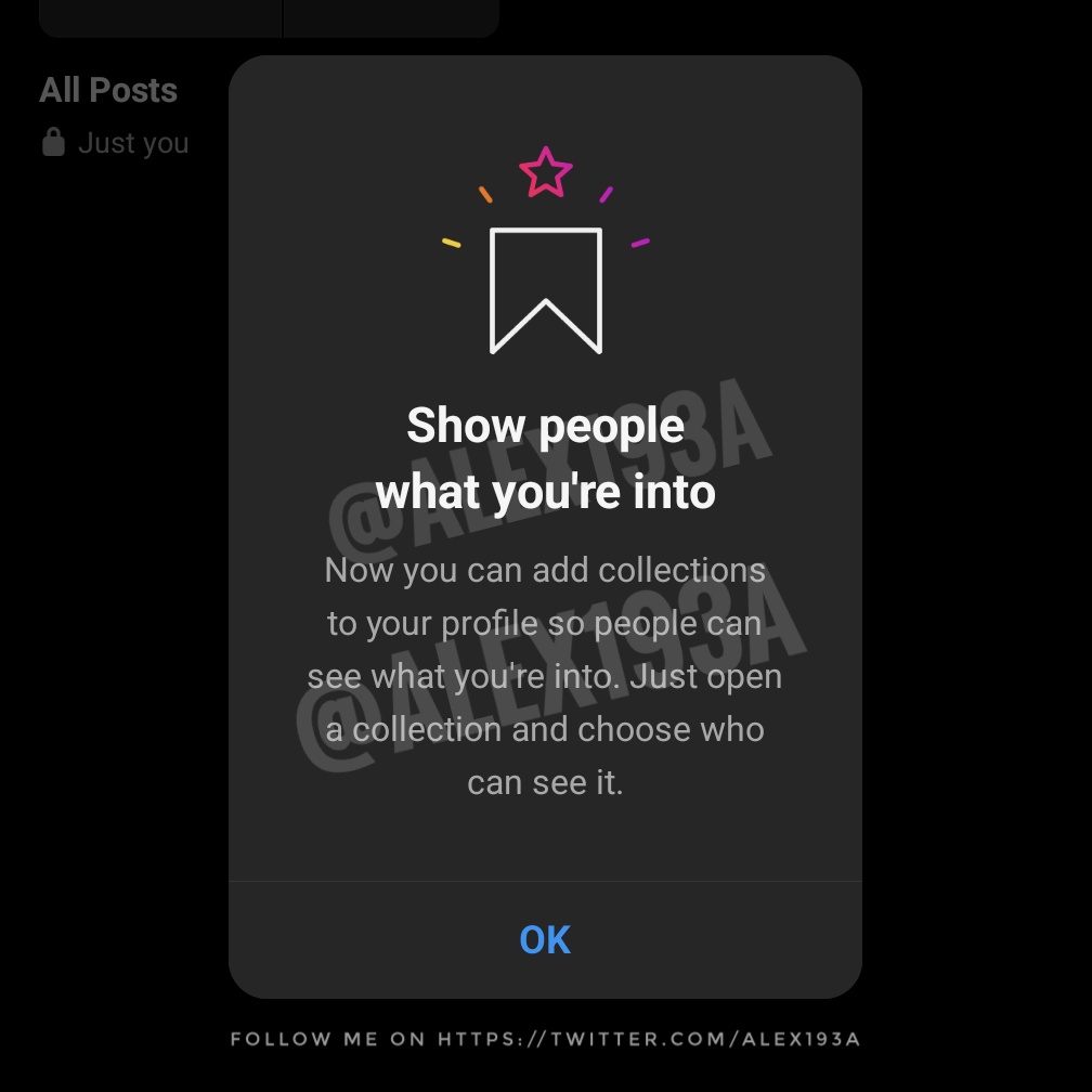 Instagram กำลังมุ่งมั่นพัฒนาฟีเจอร์ใหม่อย่าง ‘Collection’ ให้ผู้ใช้สามารถแชร์คลังโพสต์ที่ตัวเองสนใจบนหน้าโปรไฟล์ ไม่ว่าจะเป็น โพสต์ของศิลปินดาราที่ชื่นชอบ หนังสือหรือภาพยนตร์ที่สนใจ เป็นต้น เพื่อเป็นทางเลือกให้คนได้เห็นความสนใจก่อนตัดสินใจกดติดตาม