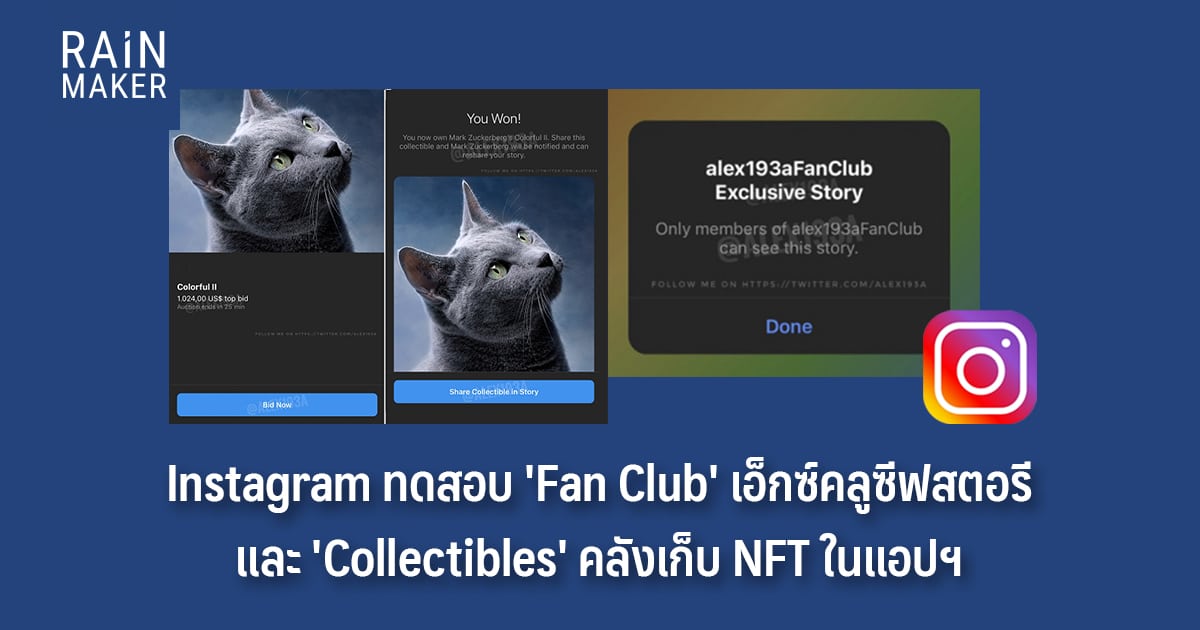อินสตาแกรมได้ทำการทดลอง 2 ตัวเลือกใหม่สตอรี ‘Fan Club’ ที่ให้ผู้ใช้สามารถโพสต์สตอรีเอ็กซ์คลูซีฟที่ให้เฉพาะสมาชิกของ Fan Club หรือกลุ่มคนที่ได้รับอนุมัติดูได้เท่านั้น และยังมีตัวเลือก ‘Collectibles’ ที่ลิงก์ไปยัง NFT (Non-Fungible Token) หรือคริปโตประเภทหนึ่ง ที่แสดงความเป็นเจ้าของของสินทรัพย์ดิจิทัลนั่นเอง