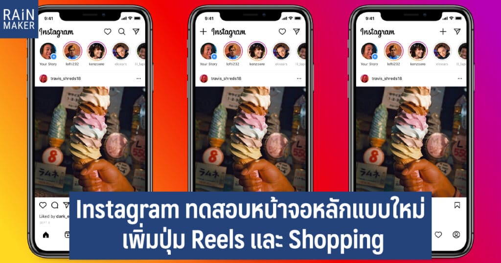 หลังจากอินสตราแกรมได้ทดสอบฟีเจอร์ Reels กันไปก่อนหน้านี้เเล้ว ล่าสุดทางแอปได้มีการลองอัปเดตปรับเปลี่ยนแถบเมนูภายในแอป โดยมีการเพิ่มปุ่ม Reels เเละ Shopping เข้าไปด้วย โดย Reels จะมาแทนที่แท็บสำรวจ ส่วน Shopping จะแทนแท็บกิจกรรม แต่ไม่ต้องตกใจไปค่ะแท็บที่ถูกแทนที่จะย้ายไปอยู่ที่มุมขวาบนของแอปแทนค่ะ