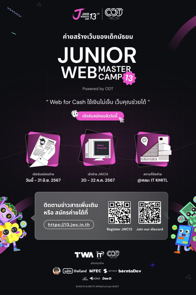 ปีนี้ค่าย Junior Webmaster Camp ปีที่ 13 กลับมาอีกครั้งในธีม Web for Cash สนับสนุนโดย ODDS Team โดยค่ายนี้เป็นค่ายที่จัดขึ้นสำหรับน้อง ๆ นักเรียนในระดับชั้นมัธยมศึกษาตอนปลายหรือเทียบเท่า อายุระหว่าง 15-18 ปี เข้ามาเรียนรู้ประสบการณ์การทำงานในแวดวงเทคโนโลยี ธุรกิจเว็บไซต์ การทำโปรดักส์ฝั่งเทคโนโลยี และสื่อออนไลน์ กับพี่ ๆ มากฝีมือในวงการ