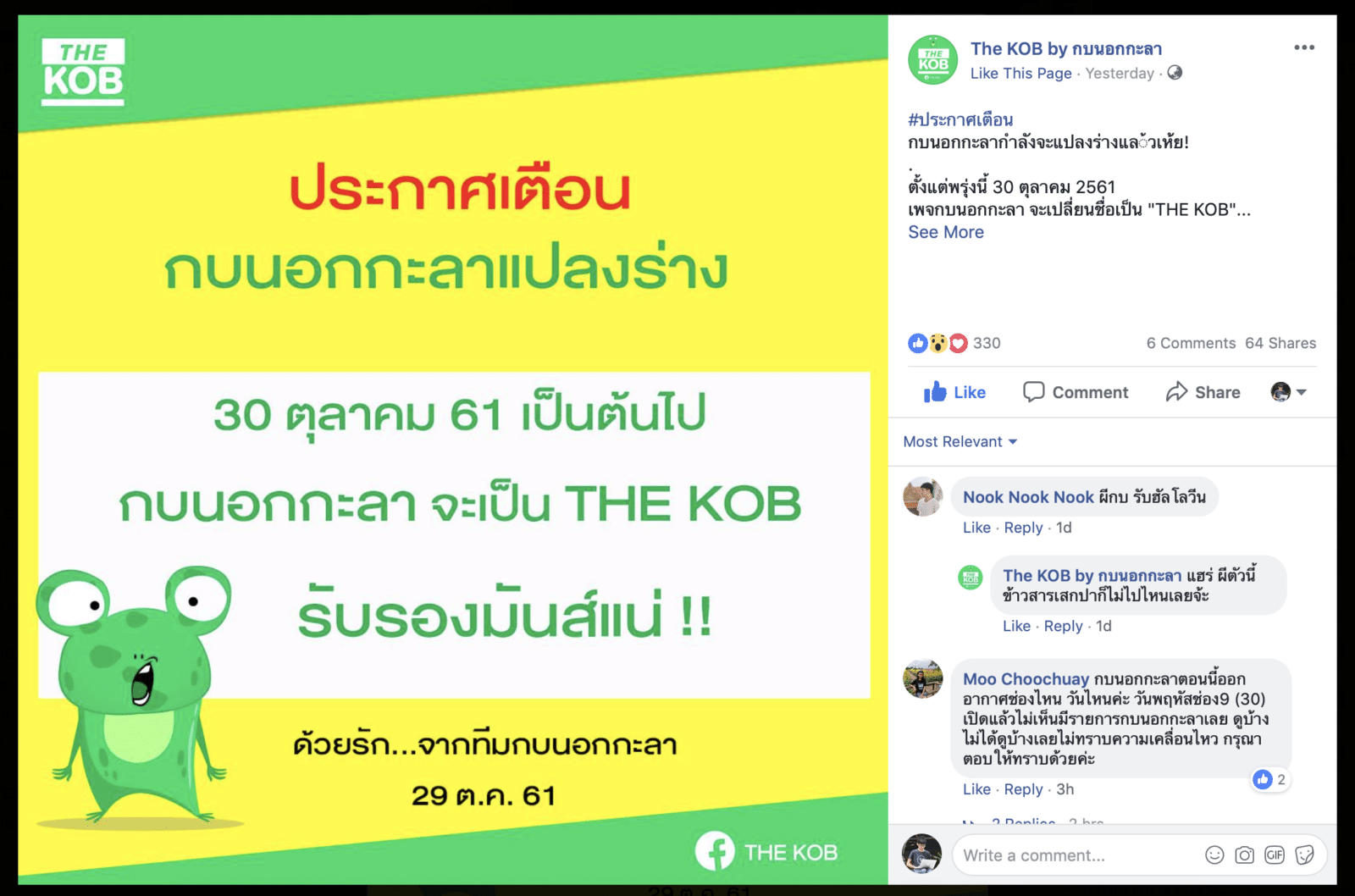 คงไม่มีใครไม่รู้จัก กบนอกกะลา รายการสารคดีสัญชาติไทยระดับตำนานที่หลาย ๆ คนโตมาพร้อม นอกจากสารคดีที่ออกทางช่องทีวีแล้ว กบนอกกะลายังเป็นเจ้าของหนังสือการ์ตูน, ค่ายเยาวชน และสื่ออื่น ๆ ออฟไลน์อีกมากมาย แต่วันนี้กบนอกกะลาประกาศผ่าน Facebook แปลงร่างเป็น “The Kob” สำนักคอนเทนต์ที่เน้นทำออนไลน์