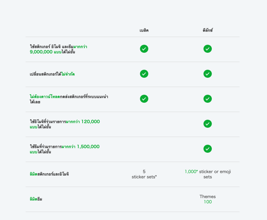 - ลิมิตสติกเกอร์และอิโมจิ 1,000 เซ็ต และลิมิต 100 ธีม