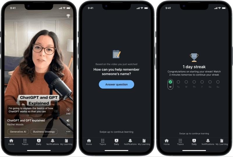รวมถึงแพลตฟอร์มยังเล็งเห็นถึงปัญหาเรื่องการจัดการเวลาเรียนของผู้ใช้งาน จึงได้ทำการแยกย่อยคอร์สเรียนออกมาเป็นคลิปวิดีโอที่สั้นลง เพื่อเพิ่มโอกาสให้ผู้ใช้งานสามารถมีส่วนร่วมกับคอร์สเรียนได้มากขึ้นตามเวลาที่สะดวก แม้มีเวลาไม่มาก แถมตอนนี้ยังเปิดตัวแอป LinkedIn Learning บนมือถือ และทดสอบโดยการนำคอนเทนต์ดังกล่าวมาไว้บนหน้าฟีดอีกด้วย