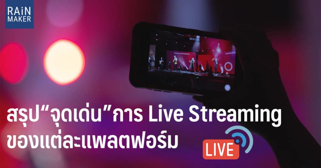 เชื่อว่าหลายๆ คนในตอนนี้คงเริ่มหันมาสนใจการ Live Streaming กันมากขึ้น สาเหตุหลักๆ อาจมาจากสถานการณ์ ณ ปัจจุบัน ทำให้เราต้องปรับตัวในเรื่องต่างๆ ไม่ว่าจะเป็นเรื่องงาน หรือการเรียน เป็นต้น และหนึ่งตัวเลือกที่ดีในการสื่อสารของช่วงนี้นั้นก็คือการถ่ายทอดสดผ่านช่องทางต่างๆ หรือเรียกอีกอย่างว่า การไลฟ์สด แต่เชื่อว่าน่าจะเป็นเรื่องใหม่ของใครหลายคนอยู่ ทำให้เกิดความลังเลและสงสัยว่าควรไลฟ์ช่องทางไหนจะดีกว่ากัน ช่องทางไหนเหมาะสมกับเรามากที่สุด วันนี้ RAiNMaker เลยได้มัดรวมจุดเด่นของแต่ละแพลตฟอร์มมาให้เพื่อประกอบการตัดสินใจค่ะ