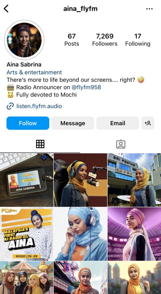 ล่าสุดประเทศเพื่อนบ้านเรือนเคียงของไทยอย่างมาเลเซียก็ได้เปิดตัว DJ ที่เป็น AI คนแรกแห่งช่อง Fly FM ที่ทางวิศวกรของคลื่นได้ร่วมมือกันสร้างขึ้นมา ซึ่ง AI คนนี้มีชื่อว่า “Aina Sabrin” โดยเธอมีลักษณะเหมือนคนจริง ๆ เป็นเทคโนโลยีที่คล้ายกับ AI Influencer ที่เคยเป็นกระแสเมื่อหลายปีก่อน