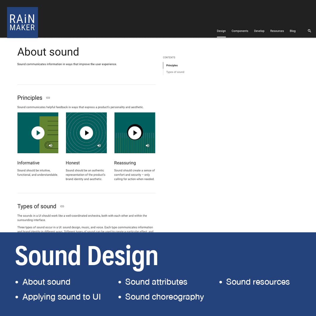 นอกจากการออกแบบ องค์ประกอบ ภาพ ไอคอน คงยังไม่พอ เพราะทีเด็ดก็คือ เจ้าเว็บไซต์ตัวนี้มีสอนไปจนถึงเสียงประกอบ ทั้งที่เป็นเสียงประกอบตั้งแต่เสียงตอนคลิก กดไอคอน หรือการเคลื่อนไหวต่างๆ บนหน้าเว็บ เพื่อเพิ่มประสบการณ์ให้คนที่เข้าเยี่ยมชมเว็บไซต์มากขึ้น ซึ่งมีสอนเกี่ยวกับเรื่องเสียง การใส่เสียงในหน้า UI ไปจนถึงสอนเรื่องความถี่ และไดนามิกของเสียง
