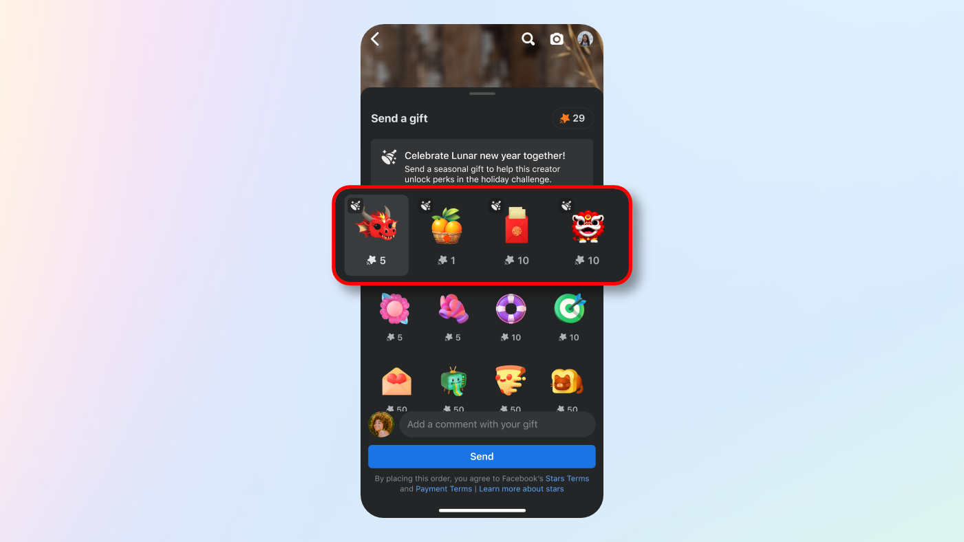 เปลี่ยนไอคอนรูปดาวให้เป็นแอนิเมชันรับตรุษจีน นอกจากนี้ ยังมีของขวัญออนไลน์ตามธีมตรุษจีน ไม่ว่าจะ มังกร ส้ม หรือซองอั่งเปาไว้ส่งให้ครีเอเตอร์ที่ชื่นชอบอีกด้วย