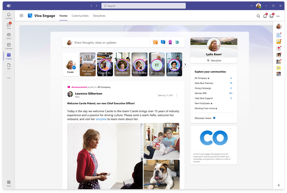แอป Viva Engage ถูกสร้างขึ้นมาให้เป็นเหมือนดิจิตัลคอมมูนิตี้คล้ายกับ Facebook มีทั้งหน้าฟีดที่เรียกว่า Storyline และ Stories ที่ช่วยเพิ่มการมีส่วนร่วมและการสื่อสารของพนักงานสำหรับ Teams และ Microsoft 365 มากขึ้น