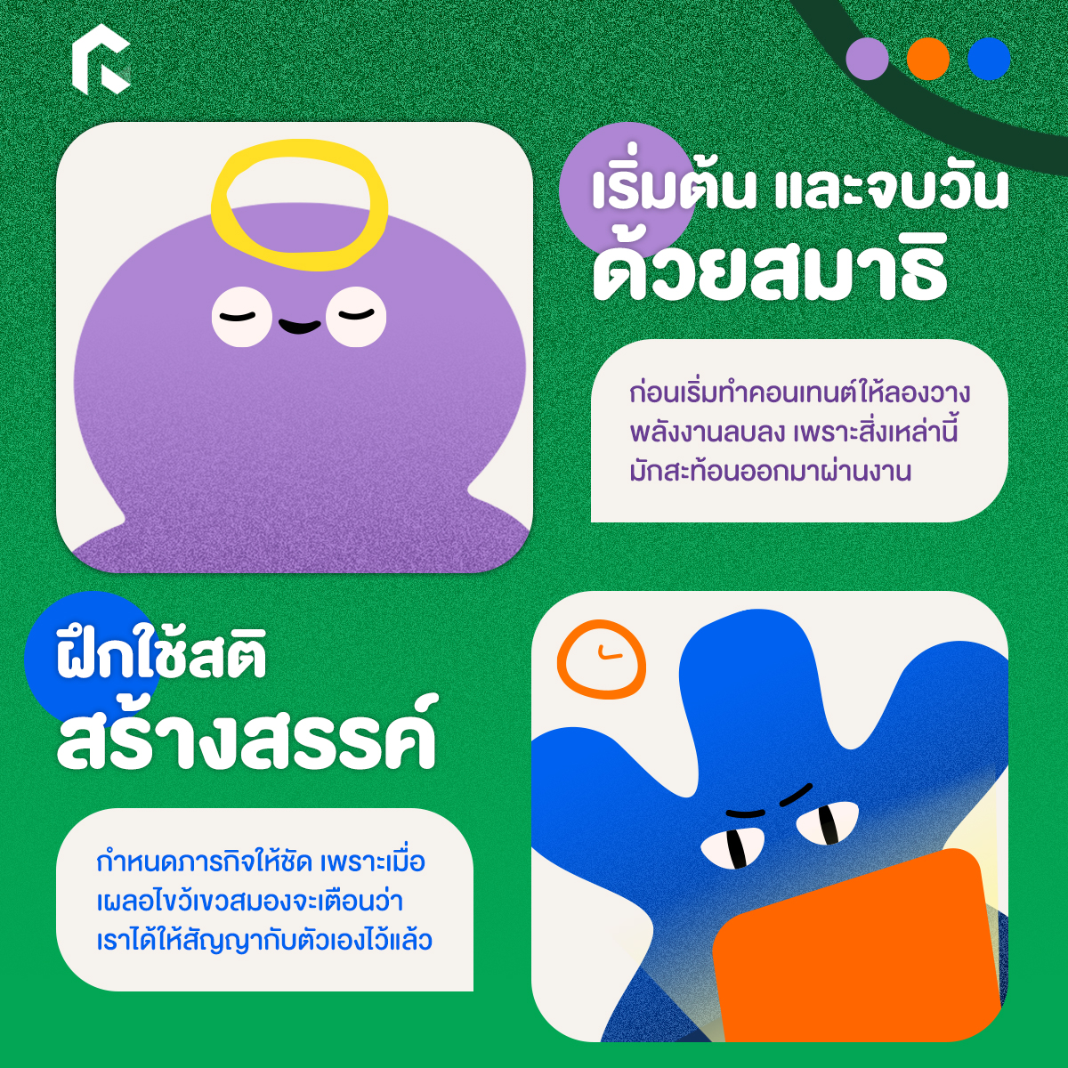 - เริ่มต้น และจบวันด้วยสมาธิ: ก่อนลงมือทำคอนเทนต์ให้ลองวางความคิด หรือความกังวลที่กวนใจเราลง เพราะพลังงานลบเหล่านี้มักสะท้อนออกมาผ่านงาน ถ้าเราไม่เคลียร์ใจก่อน อาจทำให้ผู้ติดตามเห็นสิ่งที่เราไม่ได้ตั้งใจสื่อสารออกไป และลองจบวันด้วยการรีแคปตัวเองสั้น ๆ เสมอ