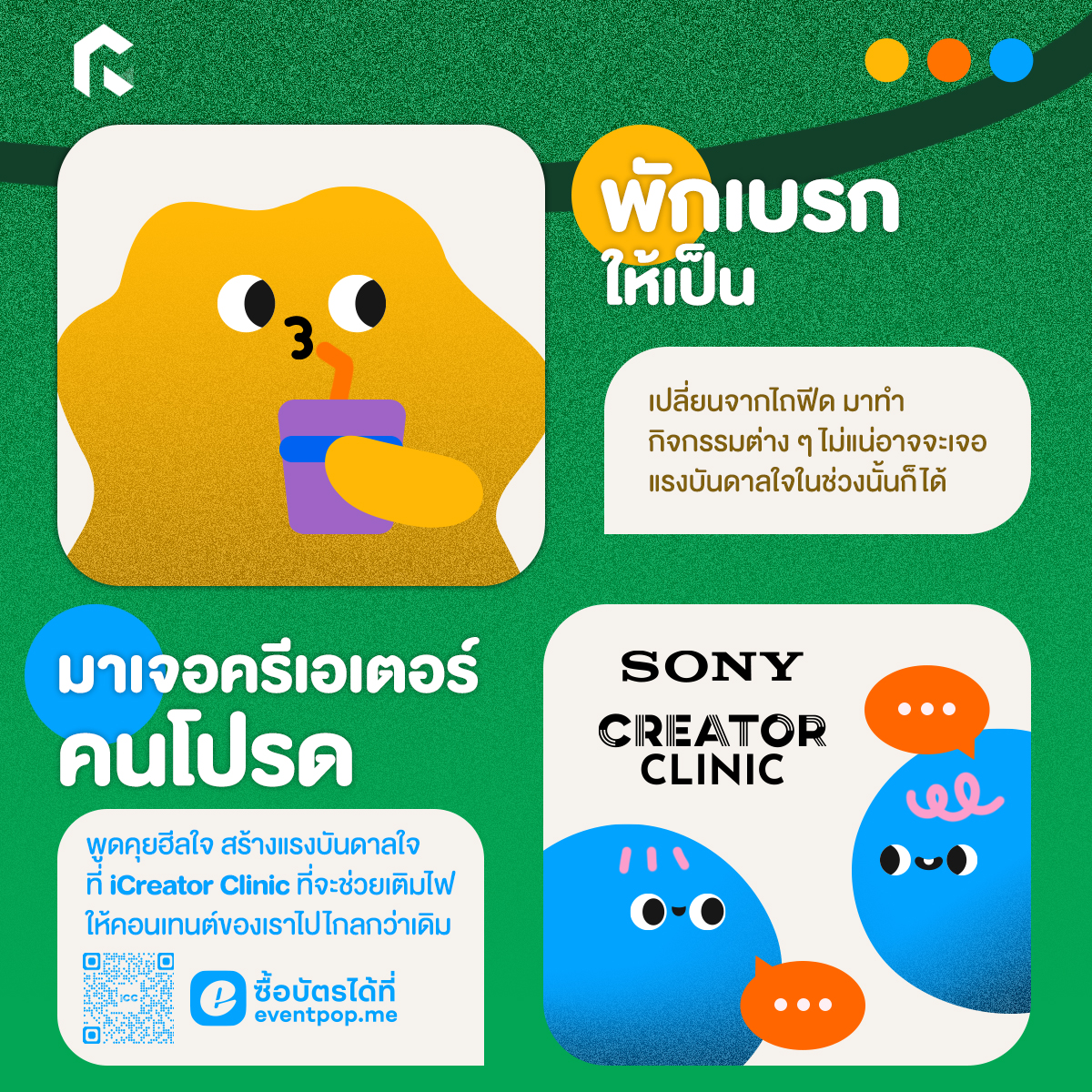 - มาเจอครีเอเตอร์คนโปรด : ลองหาโอกาสพูดคุยฮีลใจกับครีเอเตอร์ผู้เป็นแรงบันดาลใจที่ iCreator Clinic เพื่อรับไอเดีย และคำแนะนำ ที่จะช่วยเติมไฟให้คอนเทนต์ของเราไปไกลกว่าเดิม