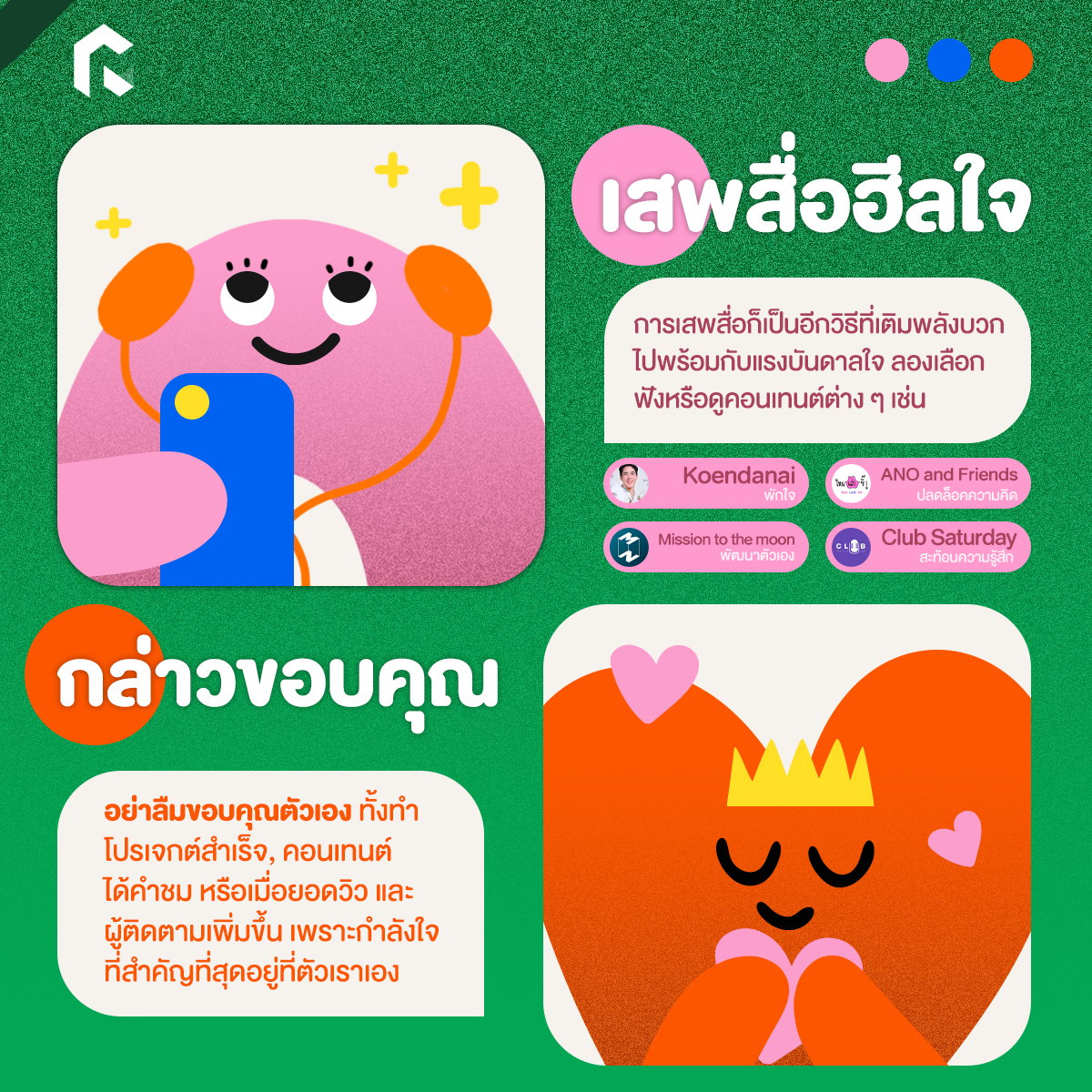 - เสพสื่อฮีลใจ: นอกจากการเป็นผู้สร้างสรรค์เองแล้ว การเสพสื่อก็เป็นอีกวิธีที่เราจะเติมพลังบวกไปพร้อมกับแรงบันดาลใจให้ตัวเอง ลองเลือกฟังหรือดูคอนเทนต์ต่าง ๆ ที่ช่วยกระตุ้นความคิด, เปิดมุมมองใหม่ หรือสร้างความรู้สึกดี ๆ เช่น