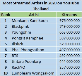 นอกจากนี้ยังมี Blackpink, Youngohm, พงษ์สิทธิ์ คําภีร์, Illslick, ไผ่ พงศธร, BTS, จินตรา พูนลาภ, RachYO และลำเพลิน วงศกร ติดอยู่ใน Top 10 ศิลปินที่มียอดสตรีมบนยูทูปสูงสุดตามลำดับ