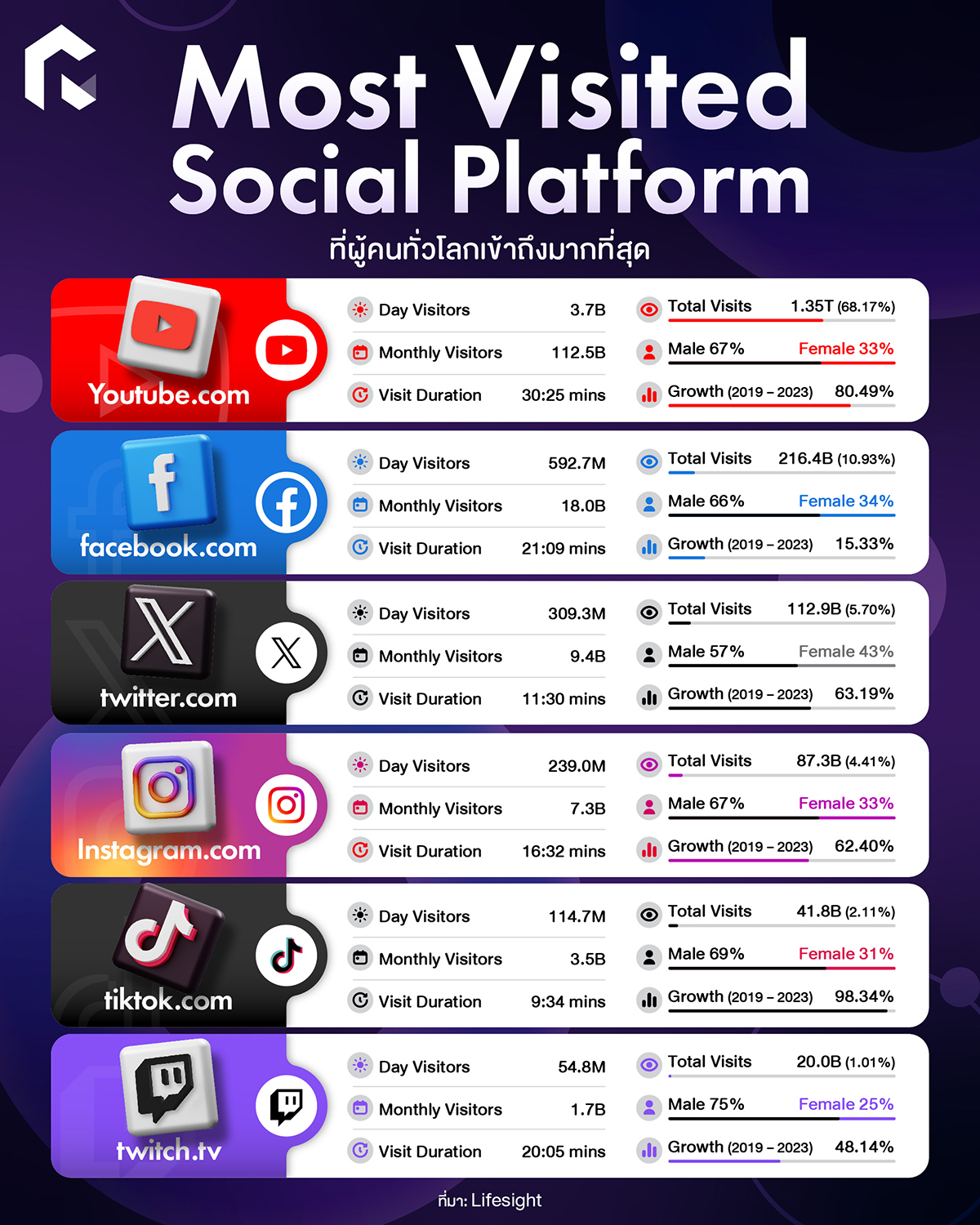 ด้วยสถิติเพิ่มขึ้นมากกว่า 1.35T ในปี 2023 จากจุดเริ่มต้นในปี 2019 แค่ 263.3B เท่านั้น ซึ่งจัดออกมาเป็น 10 อันดับแพลตฟอร์มโซเชียลมีเดียที่ผู้คนทั่วโลกเข้าถึงมากที่สุดในปี 2023 ได้ คือ