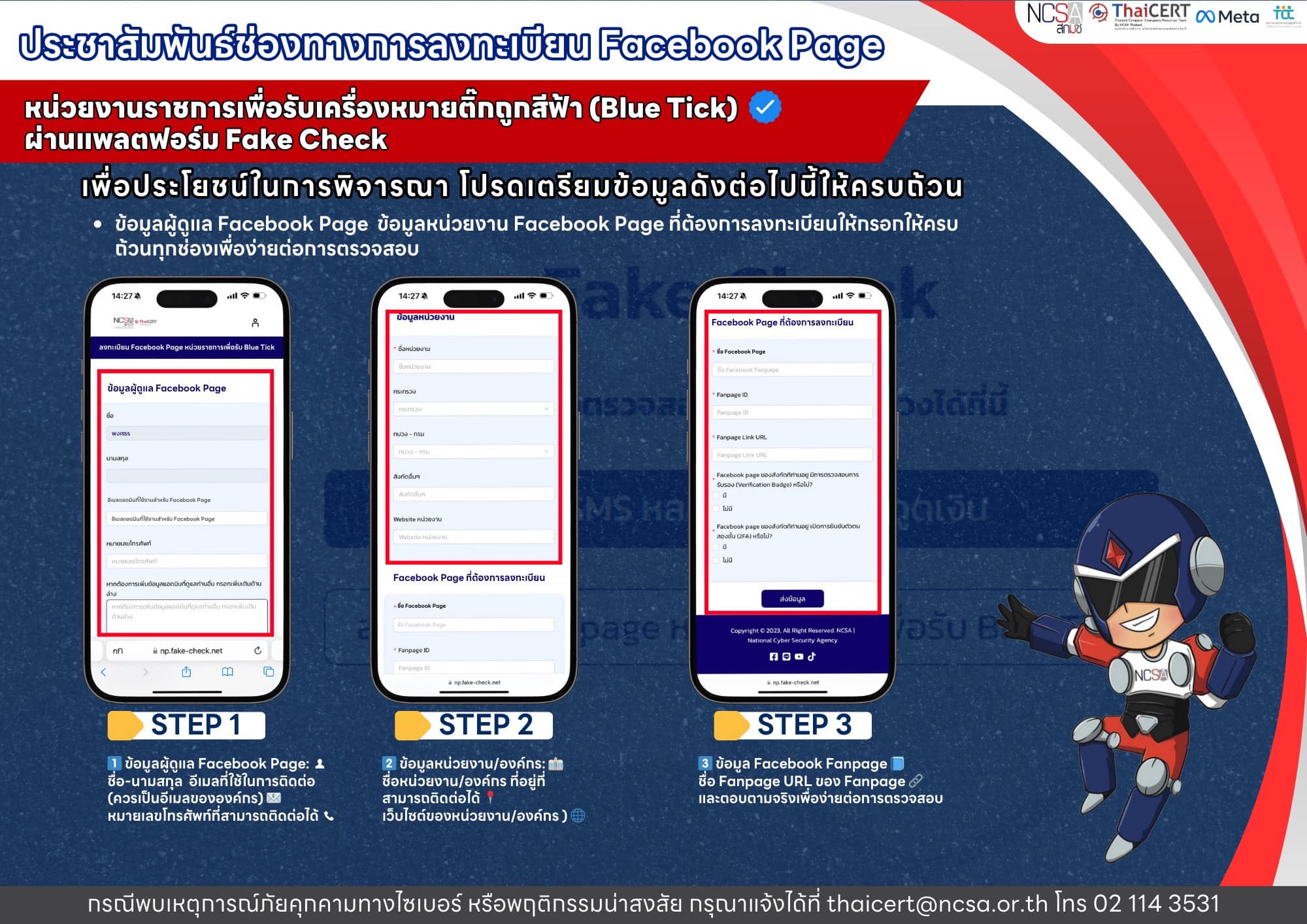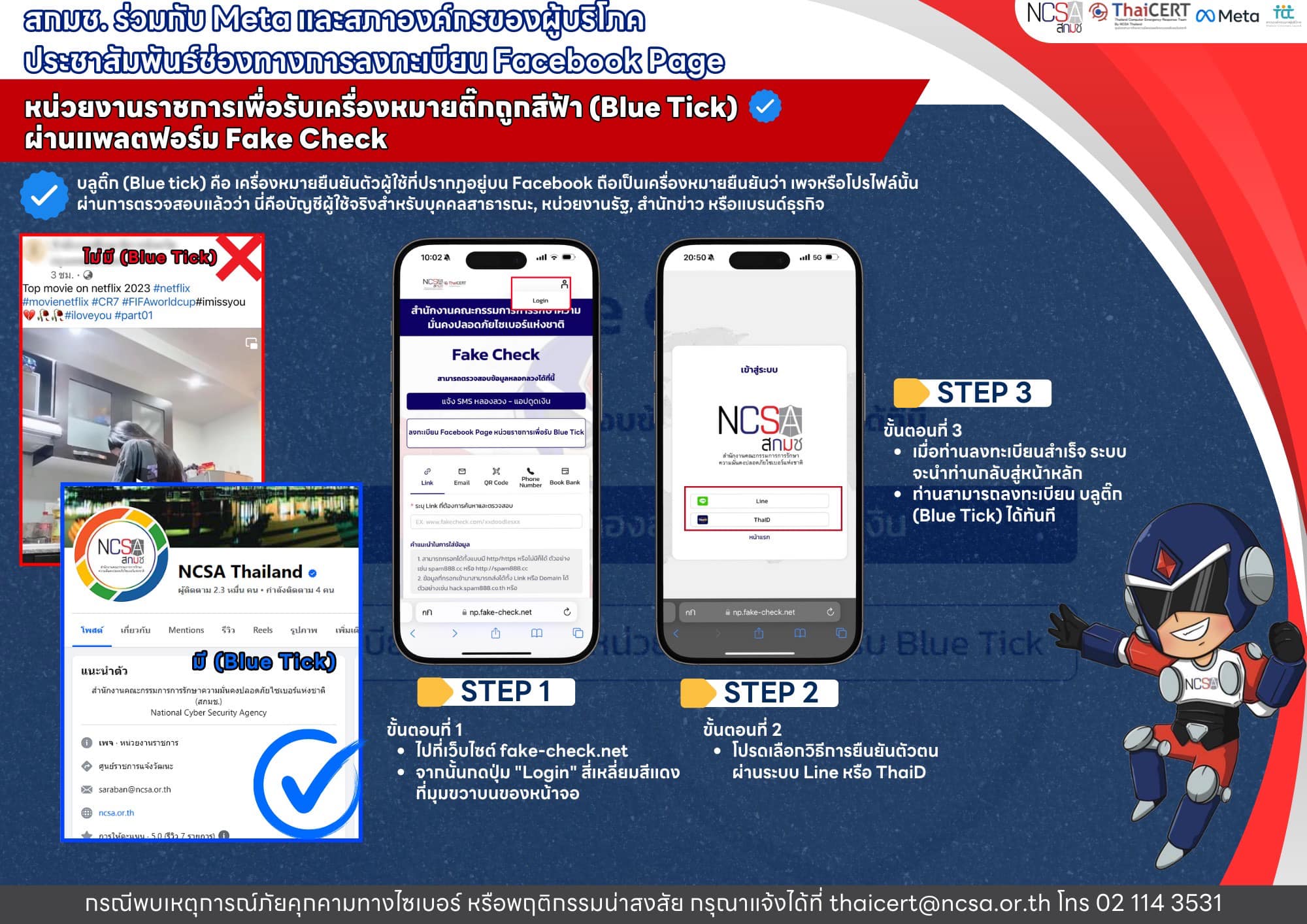 สำนักงานคณะกรรมการการรักษาความมั่นคงปลอดภัยไซเบอร์แห่งชาติ (สกมช.) ร่วมมือกับ Meta และสภาองค์กรของผู้บริโภค เปิดโอกาสให้หน่วยงานราชการและหน่วยงานของรัฐ ที่มี Facebook Page ลงทะเบียน Meta Verified ฟรี เพื่อรับเครื่องหมายติ๊กถูกสีฟ้า ยืนยันการมีตัวตน ป้องกันการแอบอ้าง หรือปลอมแปลง Facebook Page ของหน่วยงานรัฐและราชการ สามารถลงทะเบียนได้ถึง 15 ก.ค. นี้เท่านั้น