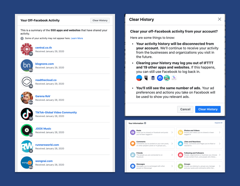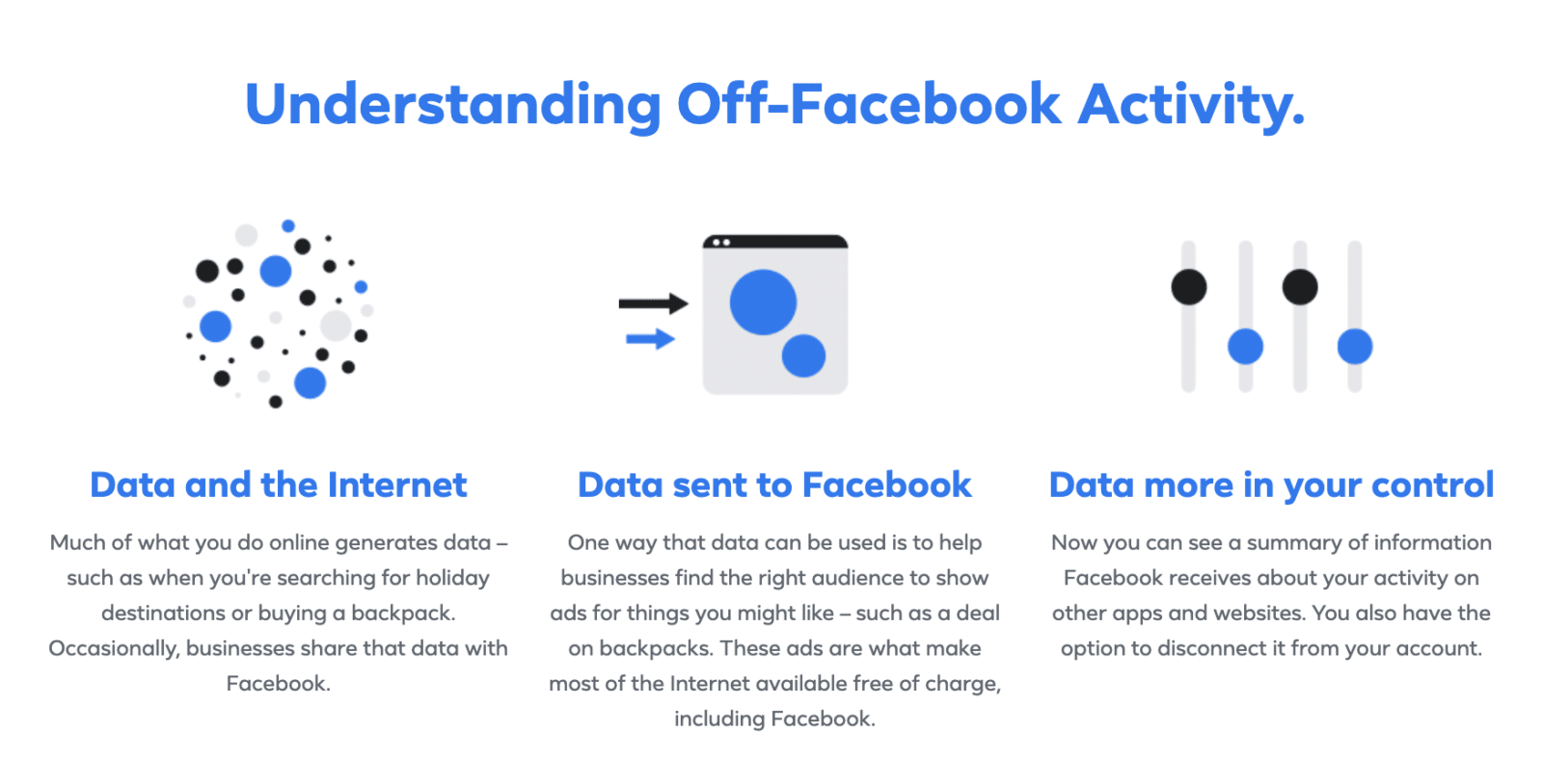 Off-Facebook Activity เป็นฟีเจอร์ที่ให้ผู้ใช้สามารถกดเข้าไปดูได้ว่ามีข้อมูลภายนอกส่วนไหนส่งข้อมูลมายัง Facebook ของเราบ้าง รวมถึงการควบคุมข้อมูลได้ตามใจชอบ มีความสามารถหลักดังนี้