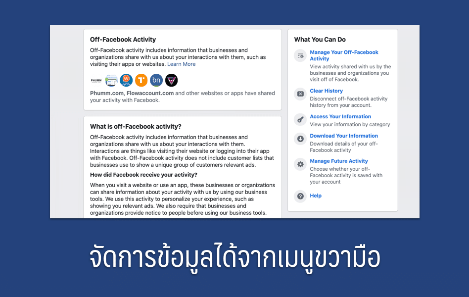 จะพบกับหน้า Off-Facebook Activity ซึ่งจะมีเมนูสำหรับจัดการข้อมูลดังกล่าวที่ด้านขวามือ