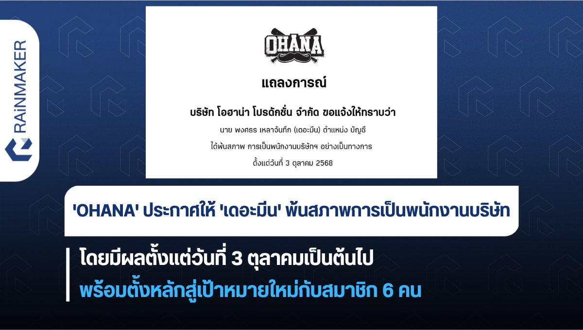 ในวันนี้ OHANA ได้ออกมาแถลงการณ์และแจ้งให้กับเหล่าแฟน ๆ ได้ทราบกัน ในนามบริษัท โอฮาน่า โปรดักชั่น จำกัด ว่า ‘นายพงศธร เหลาจันทึก’ หรือที่ทุกคนรู้จักกันในชื่อ ‘เดอะมีน’ ตำแหน่งบัญชี ได้พ้นสภาพการเปนพนักงานของบริษัทอย่างเป็นทางการแล้ว โดยจะมีผลตั้งแต่วันที่ 3 ตุลาคม 2568 นี้