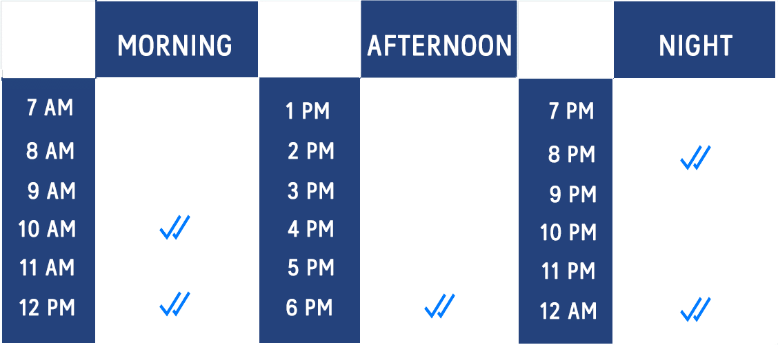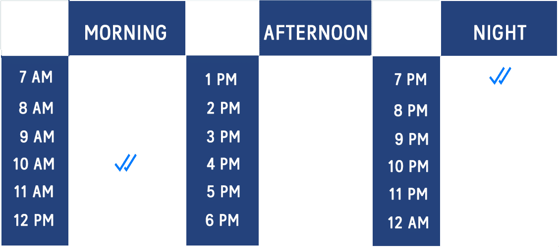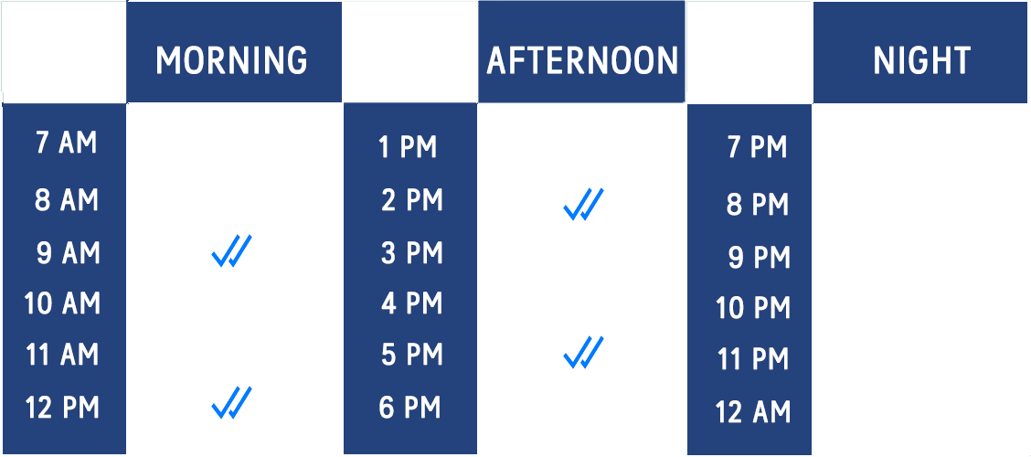 แบบที่ 1 นี้ก็เป็นระยะเวลาแบบที่ทิ้งห่างเท่าๆกัน เน้นความสม่ำเสมอ เช้า 2 บ่าย 2 เป็นเวลาที่โพสต์ได้แบบ Real Time หรือ Schedule ไว้ก็ได้ ตารางแบบนี้เหมาะกับเพจที่ทำงานกันเป็นเวลา Office Hour รูปแบบคอนเทนต์ไม่ได้อิงกับกระแสมากนัก ตารางแบบนี้นอกจากจะช่วยเรื่องความเป็นระเบียบ ยังช่วยในกรณีที่หากมีปัญหาข้อผิดพลาดเกี่ยวกับคอนเทนต์ หรือการบูสต์เกิดขึ้นก็สามารถแก้ไขได้ในเวลางานได้