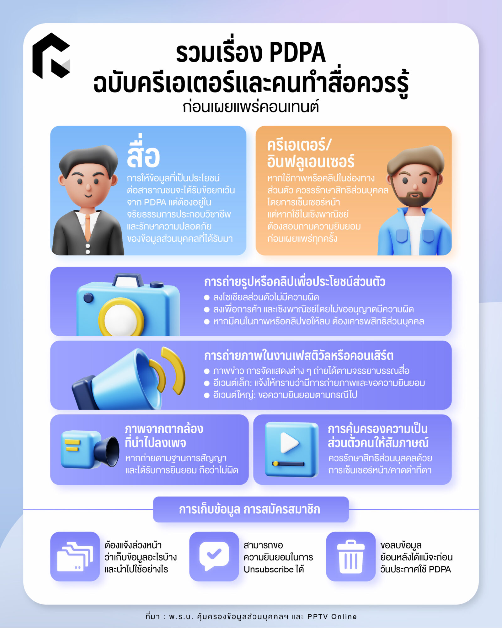 ส่วนครีเอเตอร์และอินฟลูเอนเซอร์ หากมีการนำภาพหรือคลิปไปใช้ในเชิงพาณิชย์ที่เป็นการหารายได้เข้าตัวเอง ต้องระวังการนำภาพ หรือคลิปที่ติดคนอื่นไปใช้ โดยเราแนะนำว่าให้ถ่ายติดคนอื่นน้อยที่สุด หรือหากถ่ายติดมาแล้ว ก็ควรรรักษาสิทธิส่วนบุคคล และความปลอดภัย โดยการเซ็นเซอร์หน้า พร้อมสอบถามความยินยอมก่อนถ่ายทุกครั้ง ซึ่งหากถูกขอให้ลบข้อมูล ภาพ หรือคลิปในภายหลังต้องลบทันที