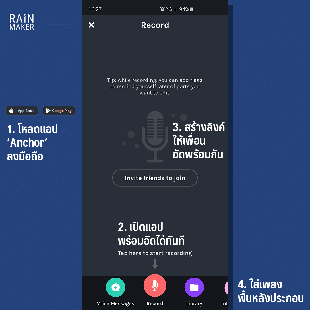 - จากนั้นเปิดแอปขึ้นมา ตัวแอปจะมีปุ่มให้พร้อมกดอัดได้ทันที