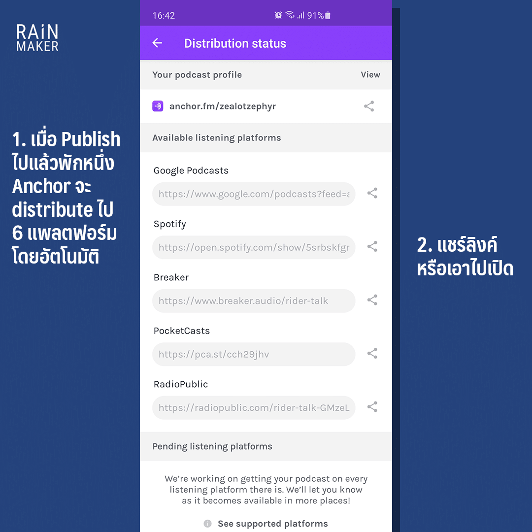 - เมื่อเรากด Publish รายการของเราใน Anchor ตัวแอปจะทำการ distribute ไปยัง 6 แพลตฟอร์มยอดนิยมของพอดแคสต์ให้เลยโดยอัตโนมัติ (แต่ต้องรอพักหนึ่ง)