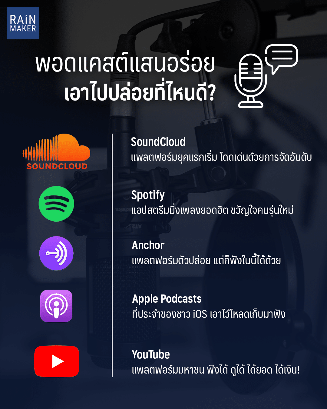 อยากทำพอดแคสต์ก็ต้องไปอัด พออัดเสร็จก็อยากให้มีคนฟัง อันนี้แหละที่คือสิ่งที่เราต้องคิดต่อ เพราะว่าพอดแคสต์เป็นเพียงแค่ไฟล์เสียงธรรมดา และไฟล์เสียงธรรมดาที่ว่านี่ก็สามารถนำไปลงได้หลายแพลตฟอร์มทีเดียว