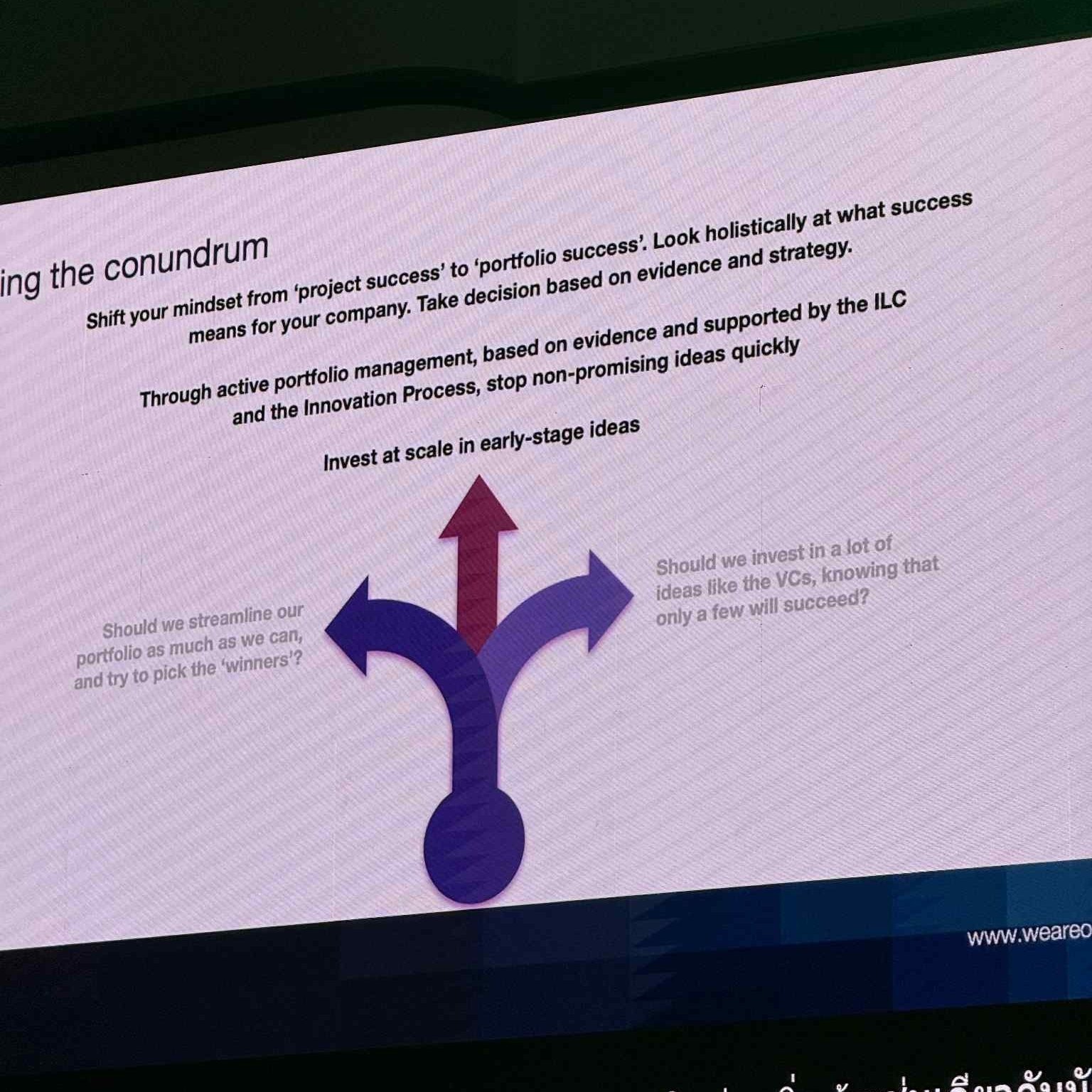 อย่างไรก็ตามองค์กรจะต้องเจอกับความท้าทายขณะทำ Portfolio Management เพราะจะต้องเลือกลงทุนระหว่างโครงการที่มีโอกาสสำเร็จสูง กับกระจายความเสี่ยงไปยังไอเดียจำนวนมาก โดยแนวทางทีาจะทำให้เราสามารถมองภาพรวมอย่างเป็นระบบ และตัดสินใจให้ถูกเพื่อเปลี่ยนมุมมองจาก ‘Project Success’ เป็น ‘Portfolio Success’ คือ