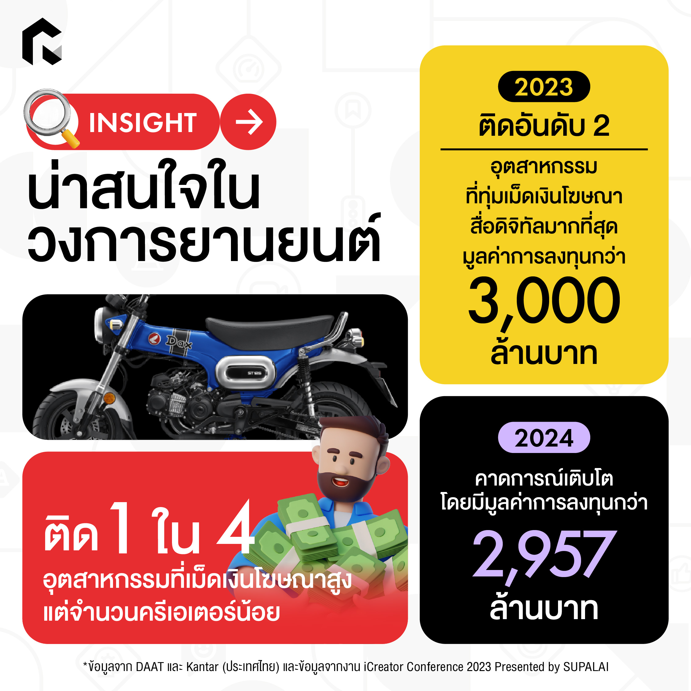 - อุตสาหกรรมยานยนต์ติด 1 ใน 4 อุตสาหกรรมที่เม็ดเงินโฆษณาสูง แต่จำนวนครีเอเตอร์น้อย