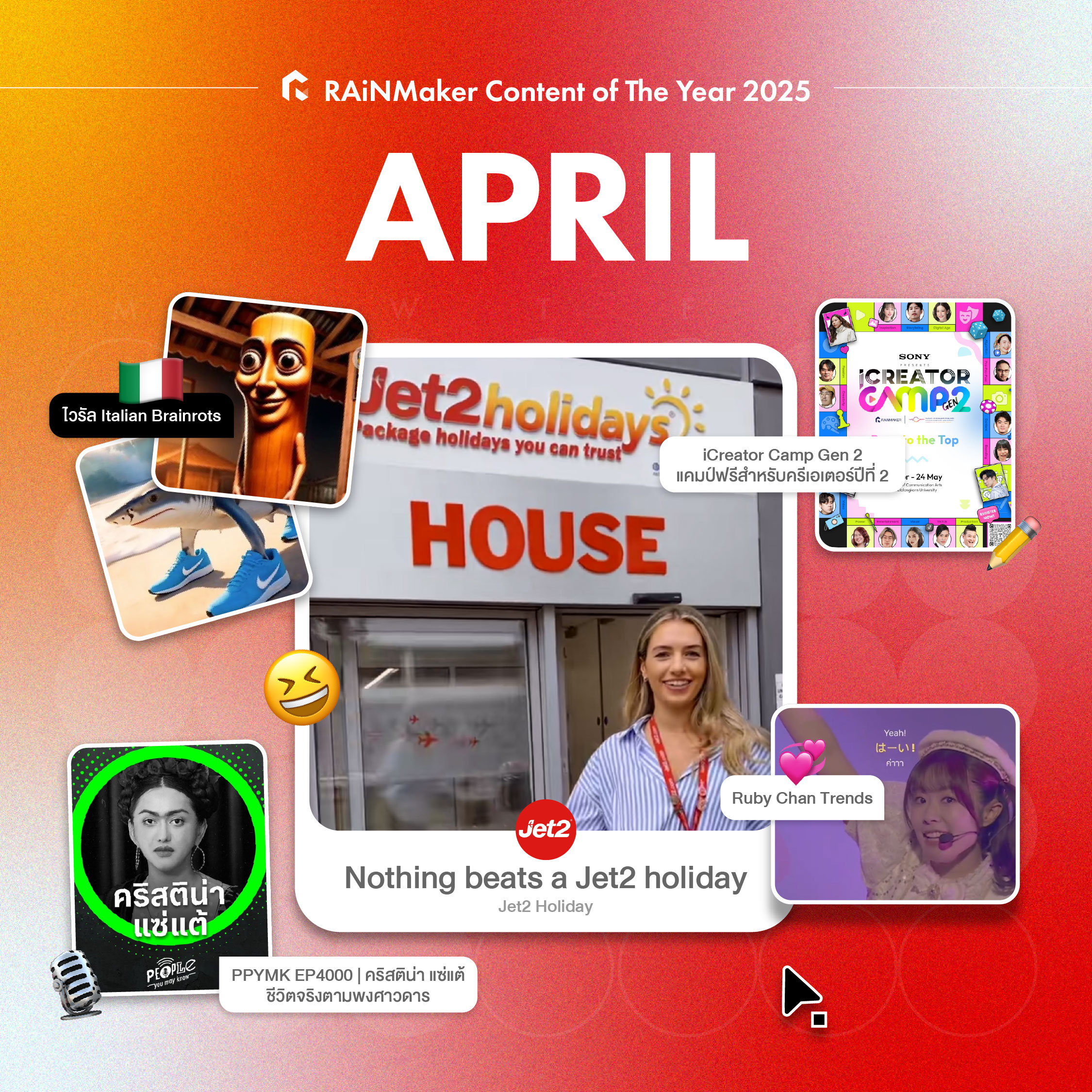 เดือนเมษายนนับเป็นเดือนที่มีเทรนด์ส่งต่ออิทธิพลทั้งไทยและต่างประเทศทั่วโลก เหมาะกับยุคที่มีคำพูดติดปากหรือเพลงติดหูหน่อยก็ไวรัลได้ เพราะผู้คนพร้อมที่เสิร์ฟคอนเทนต์เปลี่ยนไปตามเทรนด์นั้น ๆ ในขณะเดียวกันเหตุการณ์อย่าง McDonald’s ใช้ ChatGPT เจนภาพการ์ตูนลายเส้น Studio Ghibli หรือโฆษณา ‘เจนใหม่ใกล้ฉัน’ จาก Cutepress และดราม่าร้านคาเฟ่ในโรงงานยาสูบเชียงใหม่ พร้อมคอนเทนต์ ‘Human Zoo’ ก็เกิดขึ้นในเดือนนี้ด้วย