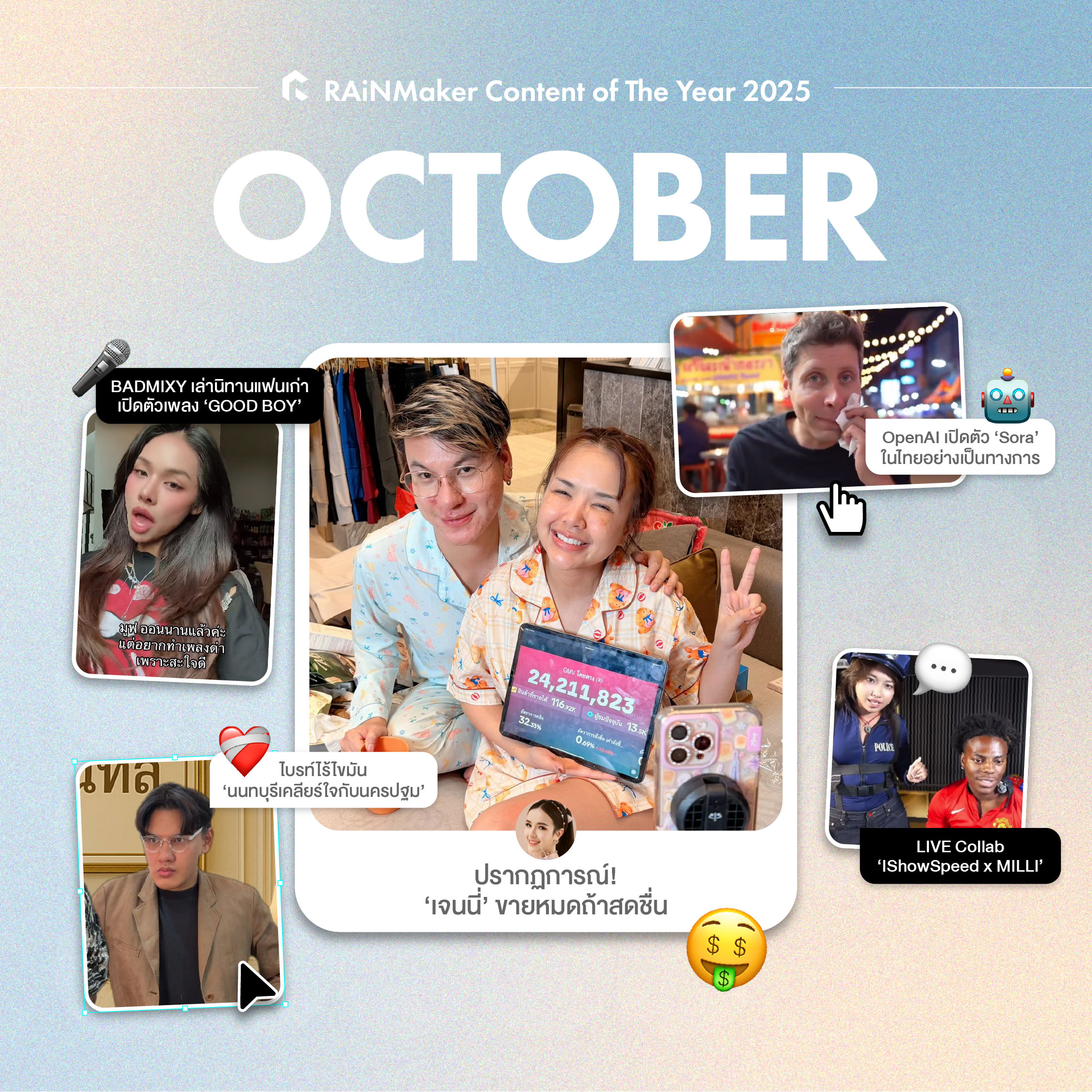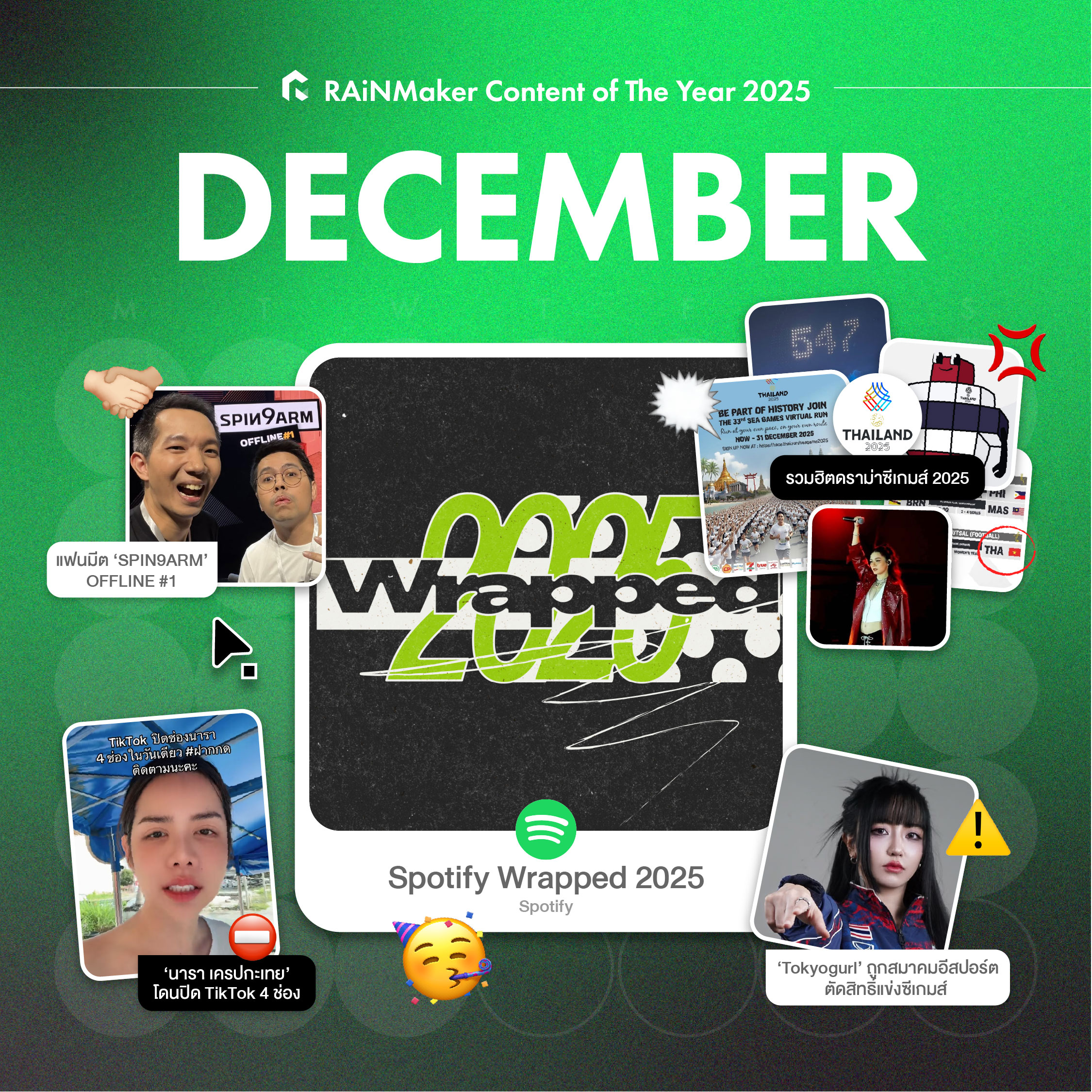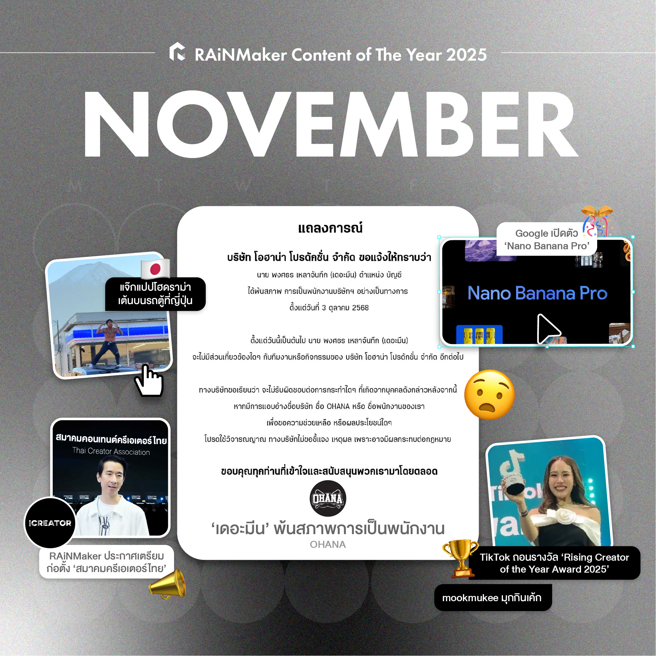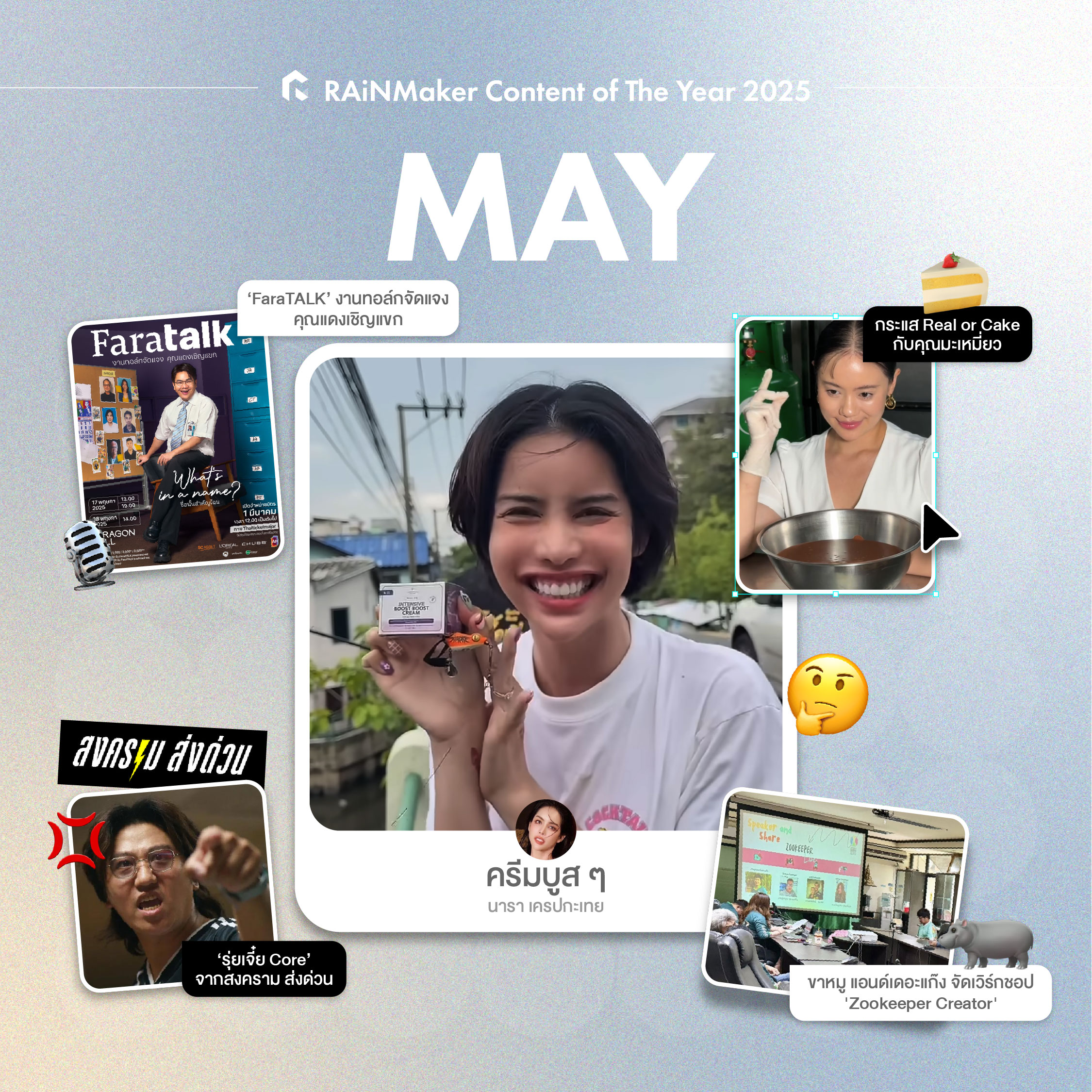 ก่อนที่จะเริ่มต้นปีใหม่กับปี 2026 ช่วงเวลาสุดยอดคอนเทนต์ ‘Content of The Year 2025’ ก็ได้กลับมาอีกครั้ง! ซึ่งคอนเทนต์แต่ละหมวดนั้นก็มีหลากหลายสถานการณ์และเหตุการณ์สำคัญไม่แพ้ปีก่อน โดยเฉพาะการอัปเดตของวงการคอนเทนต์ครีเอเตอร์ที่มีผู้ลงสนามหน้าใหม่ และผู้ที่อยู่ในสนามมานานจนต้องบอกลากันไป จนถึงไวรัลที่ฮิตติดเทรนด์และเป็นที่พูดถึงกันในไทยก็มีเพียบ ใครที่อยากรีแคปเพื่อส่งท้ายปี 2025 ทาง RAiNMaker ได้คัดมารวมให้แล้วที่บทความนี้