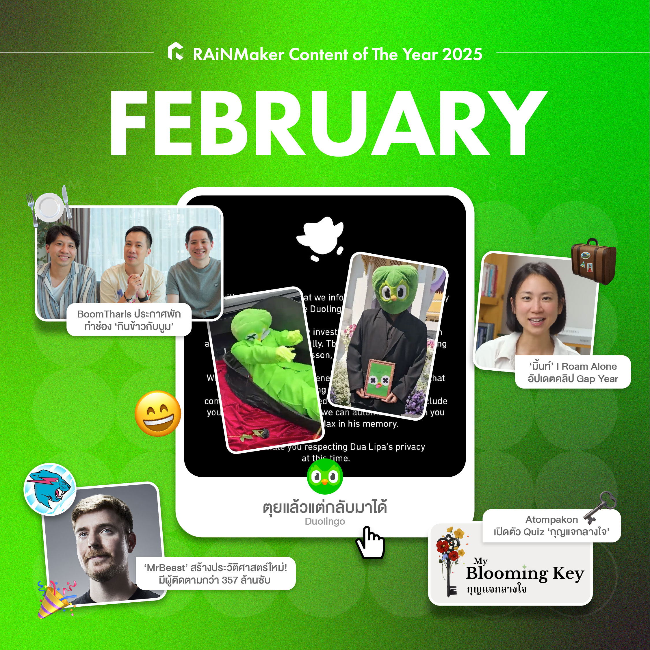 เข้ามาเดือนที่ 2 ของปีก็มีการเปลี่ยนแปลงครั้งใหญ่ในวงการคอนเทนต์ครีเอเตอร์ค่อนข้างเยอะ ทั้งฝั่งที่เริ่มมีผู้คนมากขึ้น ฝั่งที่อยากสร้างตัวตนให้ชัดเจน และฝั่งที่ทำมานานจนอิ่มตัวแต่ก็ยังรักในสิ่งที่ทำอยู่เสมอ แต่นอกจากนี้ยังเป็นเดือนที่ Facebook ครบรอบ 21 ปี, มีรวมสุดยอดโฆษณาจาก Super Bowl 2025 และ Apple ชวนทุกคนเปลี่ยนโลโก้เป็น Liquid Metal ทั่วโลก