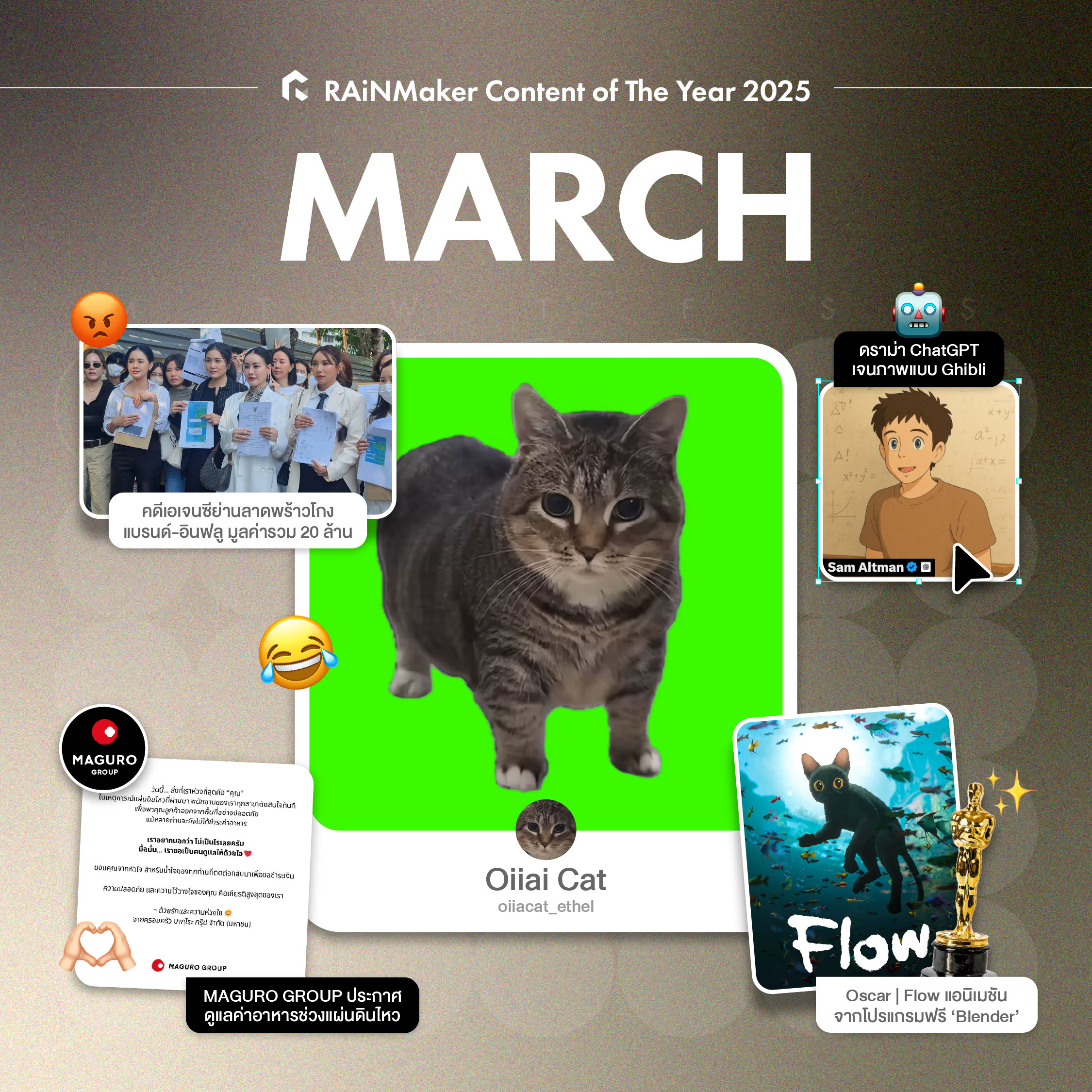 แม้ในเดือนมีนาคมจะไม่ได้มีการเปลี่ยนแปลงมากมายเท่ากับเดือนก่อนหน้า แต่ก็ปฏิเสธไม่ได้เลยว่าเหตุการณ์สำคัญที่สร้างความเปลี่ยนแปลงต่อไปนั้นก็สำคัญไม่แพ้กัน ไม่ว่าจะเป็นมีมไวรัล ดราม่าโลก AI หรือภัยพิบัติที่ไม่เคยคิดว่าจะเกิดขึ้นประเทศไทย ในเดือนนี้ก็ได้เห็นและเผชิญมาด้วยกันแล้ว