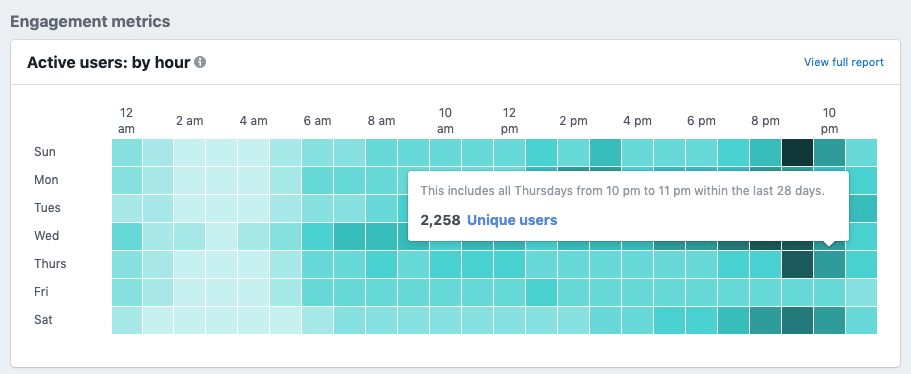 หลังจากเลือกเพจของเราแล้ว จะมีแสดงข้อมูลสถิติต่างๆ ซึ่งช่วงเวลาที่คนมามี Engagement กับเพจเราจะอยู่ที่ Engagement metrics -> Active users: by hour