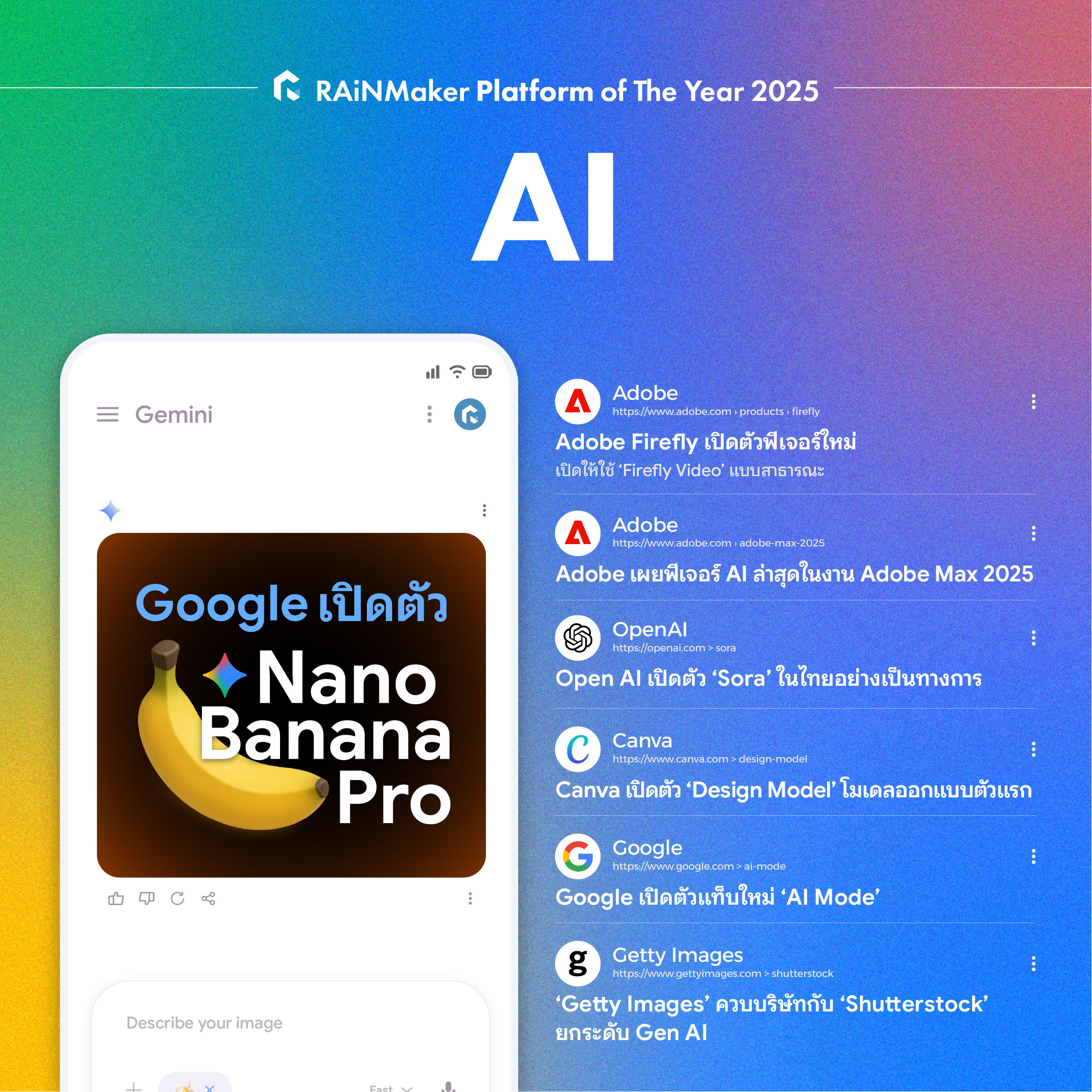 ในปีนี้วงการ AI เดินหน้าอย่างชัดเจน โดยเฉพาะฝั่งครีเอทีฟและแพลตฟอร์ม ทั้ง Google ที่ผลักดัน AI เข้าสู่ชีวิตประจำวันผ่าน AI Mode, Gemini 3 และเครื่องมือถ่ายทำอย่าง Flow รวมถึงการนำ Nano Banana เข้ามาช่วยทั้งการค้นหาและแก้ไขภาพ ขณะที่ OpenAI และ Adobe ก็เร่งยกระดับ Gen AI ให้ใช้งานเชิงพาณิชย์ได้จริง ตั้งแต่ Sora และ Firefly Video