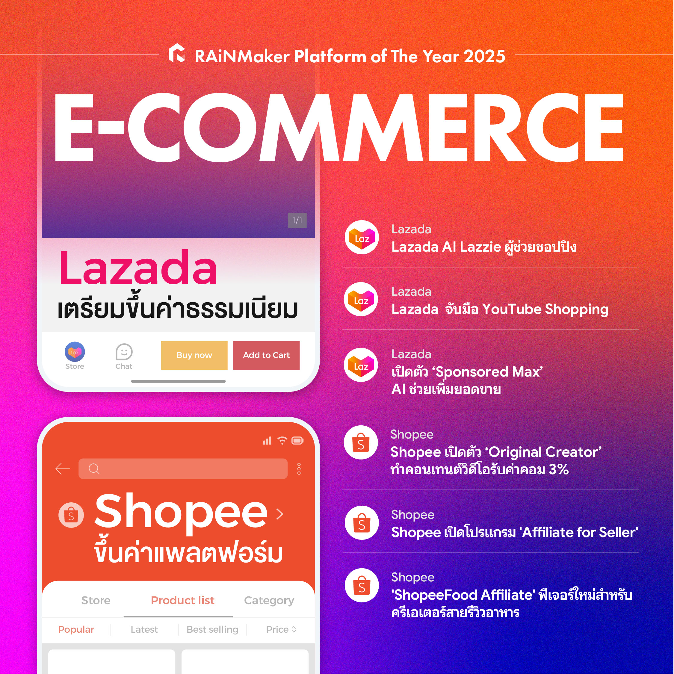 ด้าน E-Commerce ก็มีทั้งการเข้าคอลแลบกับแพลตฟอร์ม และเปิดโปรแกรมใหม่ ๆ ให้ครีเอเตอร์และแบรนด์ได้มีบทบาทมากขึ้น เพราะปฏิเสธไม่ได้เลยว่าทุกวันนี้ผู้คนให้ความเชื่อใจคอนเทนต์และเสียงของครีเอเตอร์ที่มาคอลแลบกับแบรนด์มากกว่า