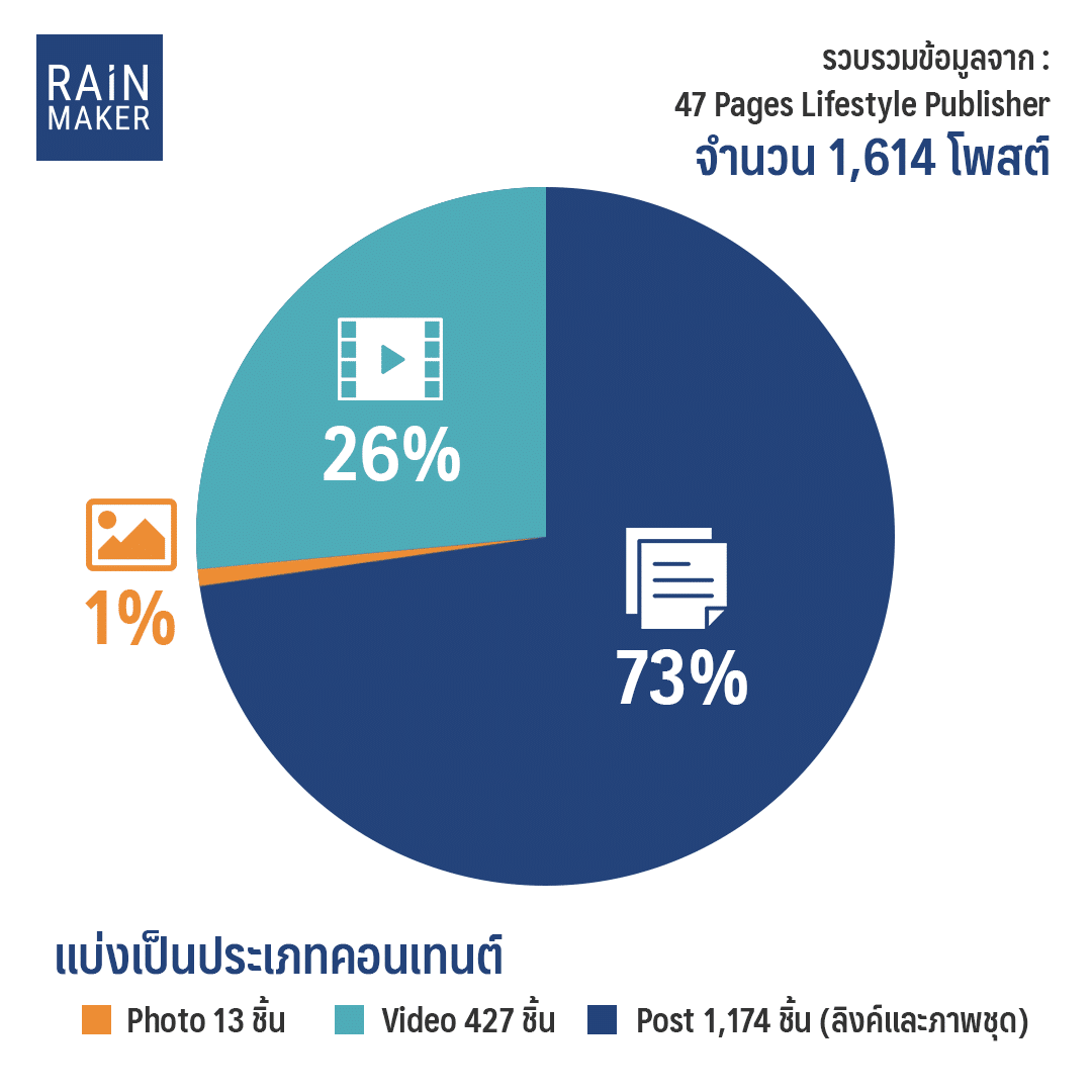 สำหรับงานสำรวจชิ้นแรกของ RAiNMaker Research เป็นการสำรวจภาพรวมของ Lifestyle Publisherในไทยทั้งหมด 47 ราย จำนวน จำนวน 1,614 โพสต์ที่เป็นลักษณะงาน Advertorial บนแพลตฟอร์ม Facebook Page ในระหว่างเดือนมีนาคม – เมษายน 2562 ออกมาเป็นสถิติที่น่าสนใจดังต่อไปนี้